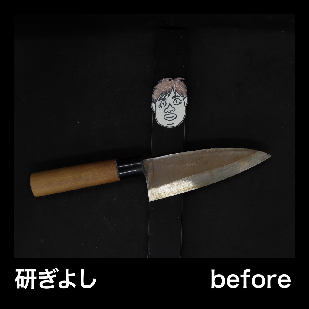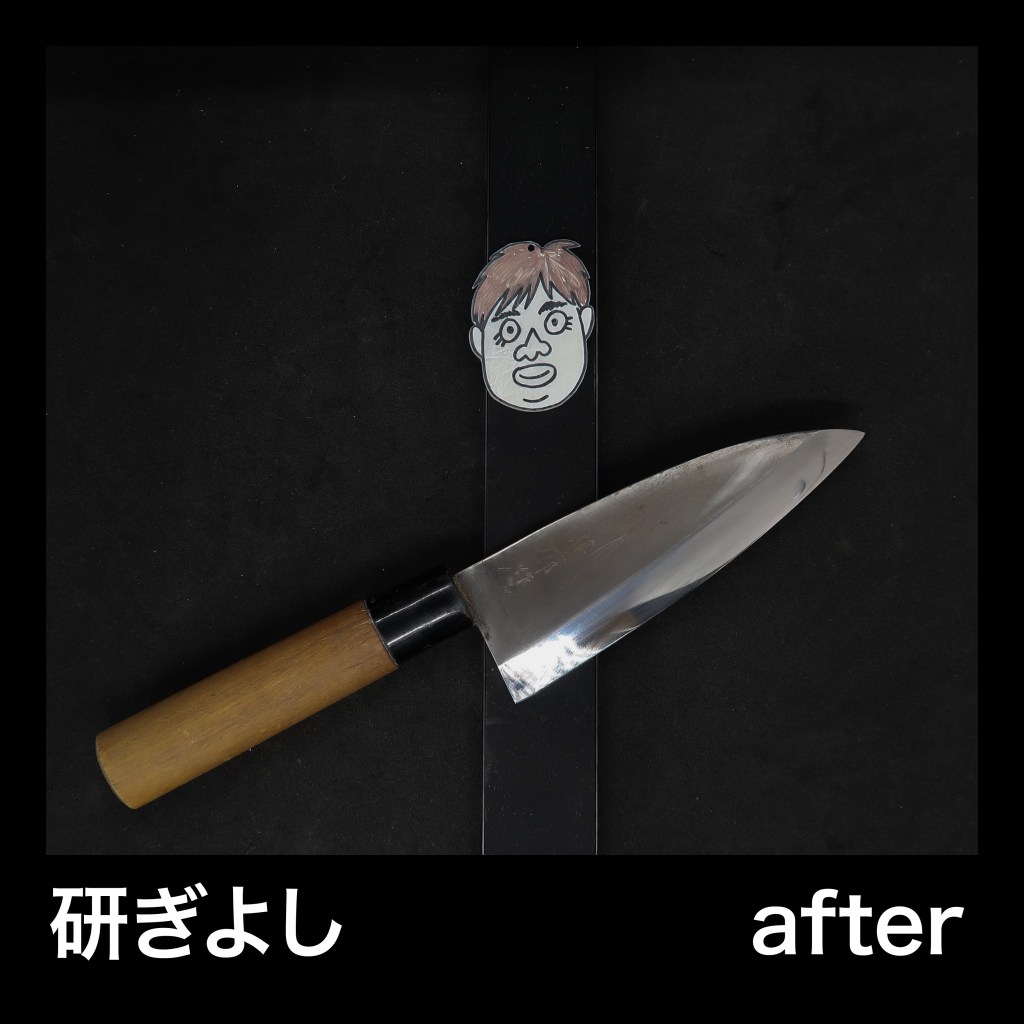 こんにちは、家庭を笑顔にする魔法のような包丁を研ぐ木元です。今日はこの1本を研ぎ澄ましました。なんと40年前に購入されたものだそうです。父親から引き継いだそうで、最近は使っていなかったそう。研げるかどうか相談に来られました。見たところ錆も殆ど無く研いで再生可能と判断しました。もしかして鋼ではなくステンレスかと思い磁石の付き具合で確認したらステンレスでした。どうりで波紋が出ない訳です。それにしてもステンレスだといえ、ここまで錆びていないということは手入れが良かったのですね。末永く使ってください。