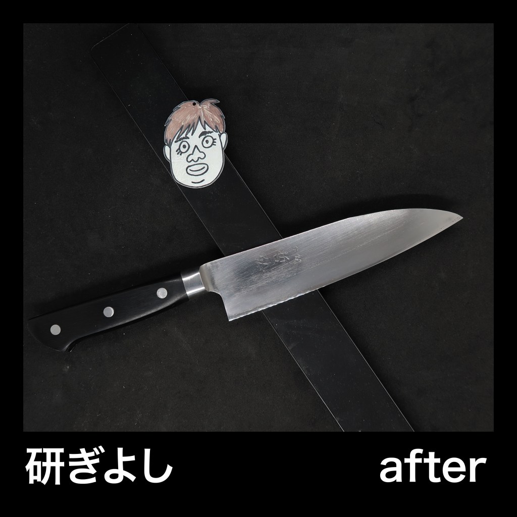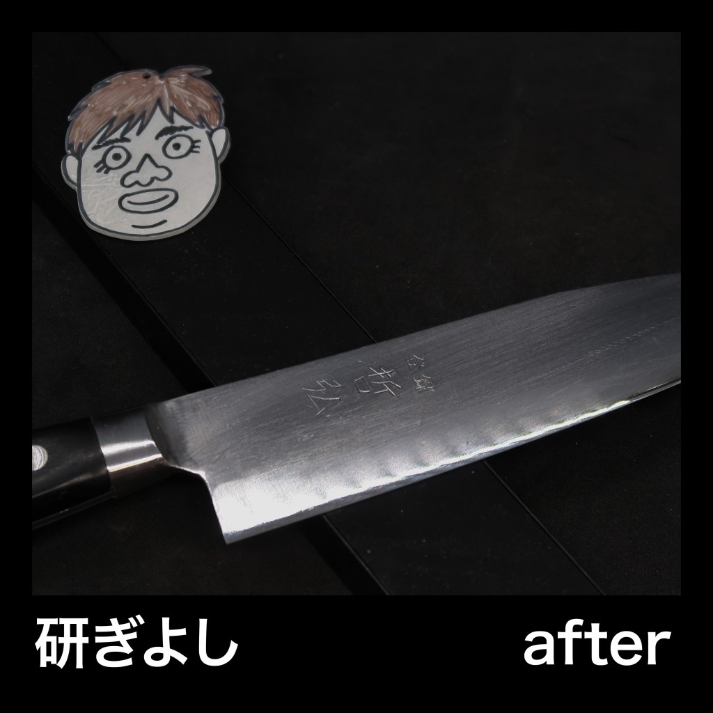 こんにちは、家庭を笑顔にする魔法のような包丁を研ぐ木元です。今日はこの我が家の包丁を研ぎ澄ましました。旭川市の中野特殊刃物工業謹製の哲弘の三徳包丁。妻のリクエストで峰の先端の方を削り牛刀に近づけています。今回最後にダイヤモンドペーストで磨いてみたところ思った以上にピカピカに。時間をかけて粒度の低い方から順に磨くともっとピカピカなのでしょうけどペーストが1種類しか持っていないので、こんなところです☺️