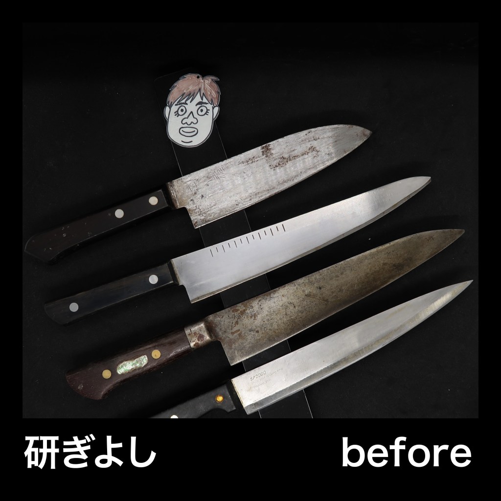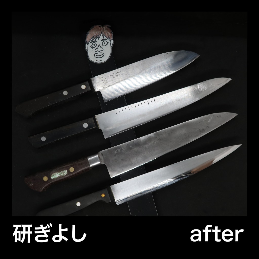 こんにちは、家庭を笑顔にする魔法のような包丁を研ぐ木元です。今日はこの4本を研ぎ澄ましました。前回出刃包丁を研ぎ出して下さった方。出刃の切れ味か良かったのでリピートしてくださいました。持ち込まれたのはかなり使い込まれた包丁達。今回の研ぎで息を吹き返しましたよ😉一番小さい三徳包丁は背が厚くとても重い包丁です薄い出刃のような感じ、なので刃身をしっかり落として切れ味を良くしています。一番下の細長い包丁は筋引き包丁なので片刃。切刃を見ると手付かずのままでしたが全部落として刃を立て直しました。汚れていた牛刀は磨いてバッチリ仕上がりました。刃先の欠けていた牛刀もかたちを整えて仕上げました。