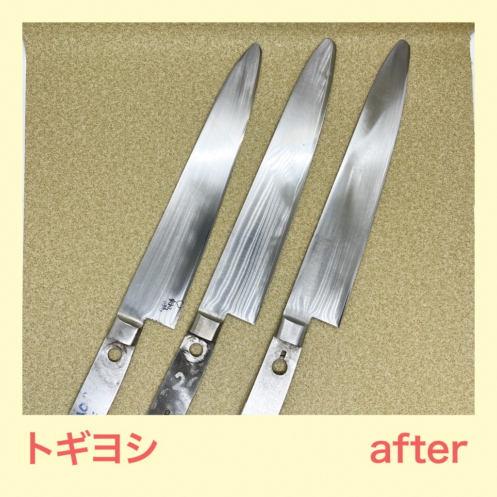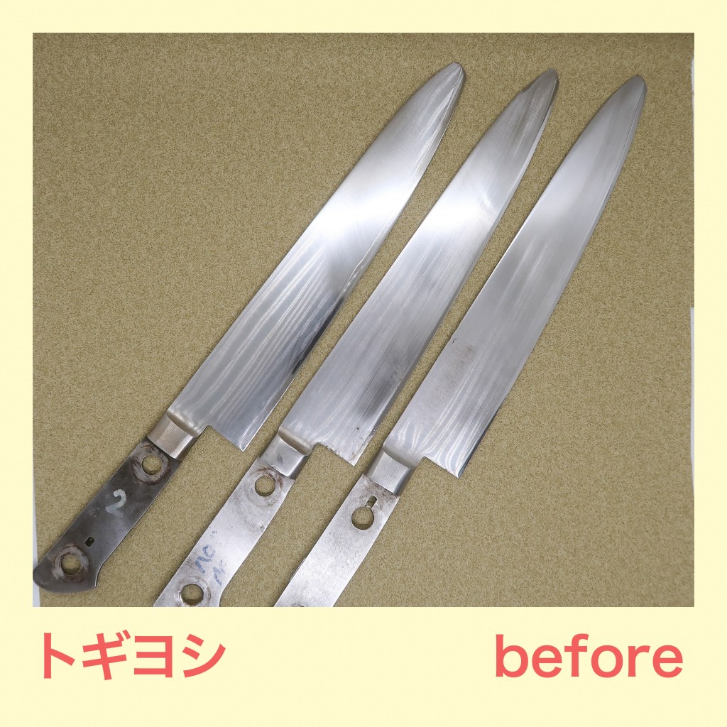 トギヨシの木元です。今日はこの3本を研ぎ上げました。大根の葉を切る機械の包丁。リピートいただきましてありがとうございます。釧路では今が大根の出荷のピークだそうで、この包丁がバリバリ働いてくれています。一度研いでいますので心地よく研げました。1本は手元近くに割れが発見されましたので使わない方が良いかもしれません。