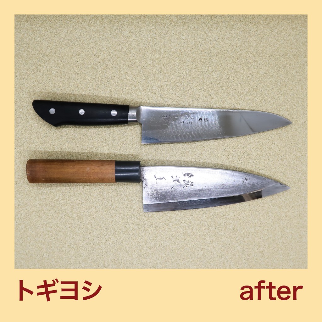 トギヨシの木元です。今日はこの2本を研ぎ上げました。塩セミナーand包丁研ぎin釧路に参加される予定だったお客様、わざわざ新橋まできてくださいました。ありがとうございます。北王の出刃包丁。柄の色合いから20年は経っていそうな歴史を感じます。しかし錆びは殆ど無く手入れが良かったことを示しています。そんな大切な包丁ピッカピカに仕上げました。正広のMS3000牛刀は油汚れが残っていたのと細かい傷が半分より前に集中してありましたので徹底的に磨き上げることにしました。傷を消すには中砥で徹底的に磨くことが大丈夫ですね。