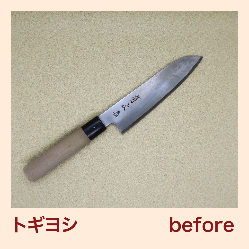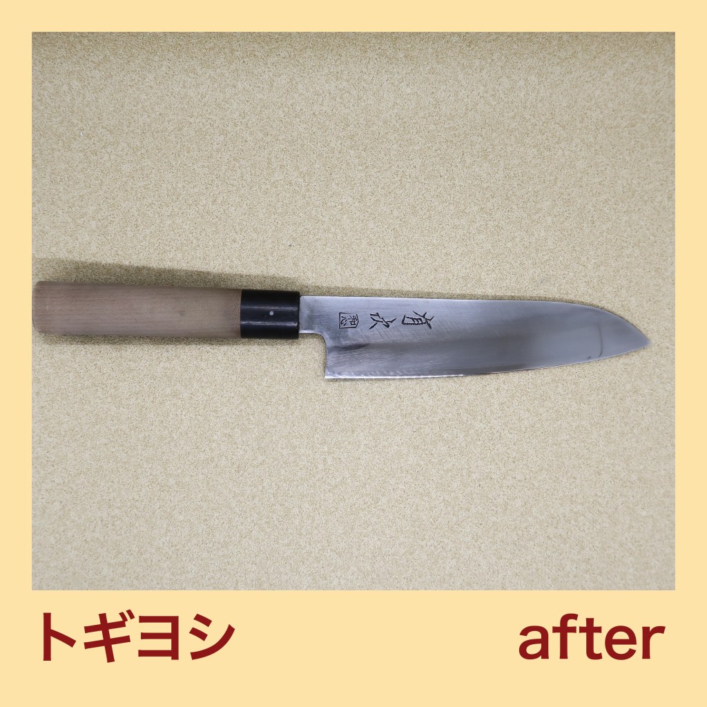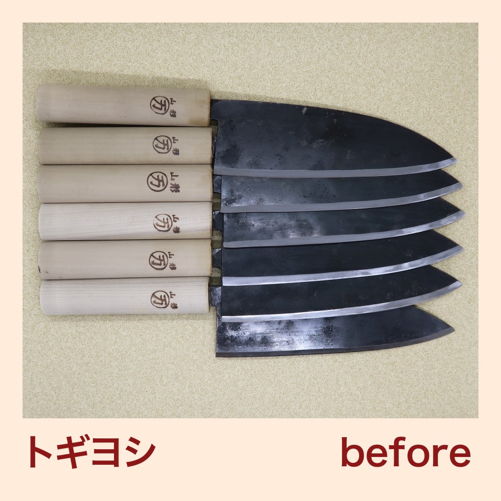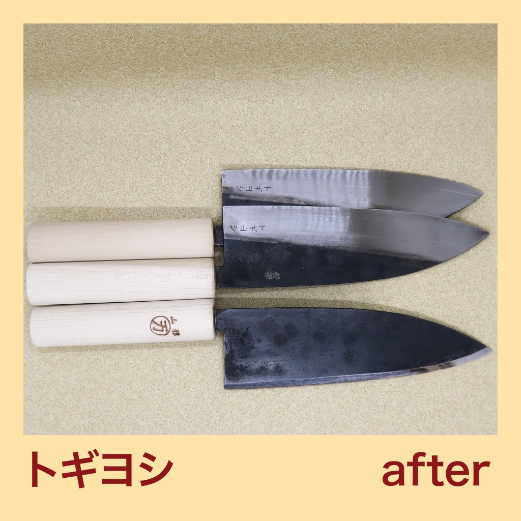 トギヨシの木元です。今日はこの4本を研ぎ上げました。有次の舟行包丁はお得意様の包丁。いつもありがとうございます。この包丁は鋼がかなり硬くて研ぐのに難儀しますが仕上がると切れ味が最高です!マルマン佐藤の加工出刃は仕上げ研ぎを施しました。届いたままでは仕上がりにバラツキがあるので研ぎ直してから販売しています。今回からトギヨシの文字をレーザー刻印してみました。