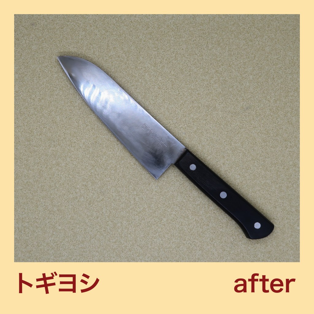 トギヨシの木元です。今日はこの1本を研ぎ上げました。リピートのお客様。ありがとうございます。関一幸の三徳包丁、刃幅はそれほど減ってはいませんが柄の部分を見ると錆びがあり永く使われているようです。まだまだ現役で活躍できるようにしっかりと仕上げました。