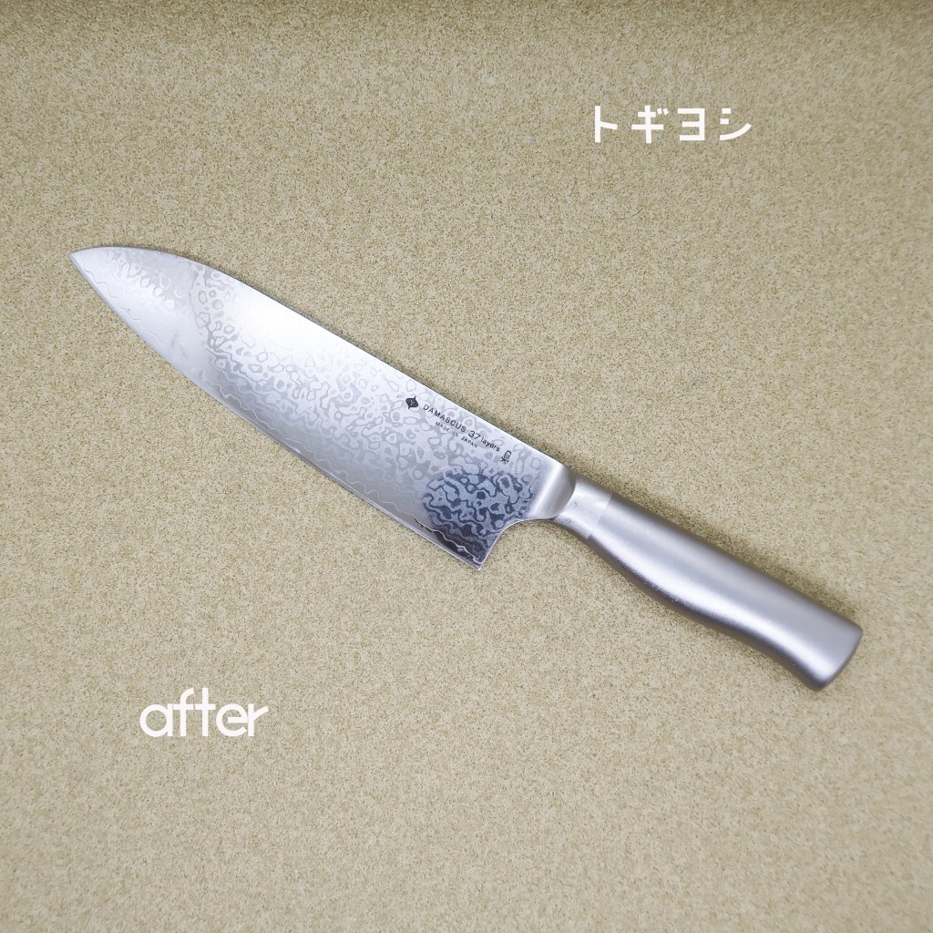 トギヨシの木元です。今日はこの4本を研ぎ上げました。若草の出刃は魚をさばいた後そのままの状態で結構錆びていましたが磨いてみたら刃先の錆は深くなく錆穴が出てこなかったのでよく仕上がりました。樹脂ハンドルの牛刀は貝印の牛刀、もう30年も経つそうです。ですが刃幅が減っていなかったのでまだまだ使えます。ダマスカスの三徳は柳宗理ブランド。1万円以上するのですね。まだ一度も研がれていなかったので順調に仕上がりました。関孫六の小ぶりな出刃はご自身で研いでみたそうですが、残念ながら刃先まで砥石が当たっていなかったようです。切刃を研ぎ直してピッカピカの仕上げました。