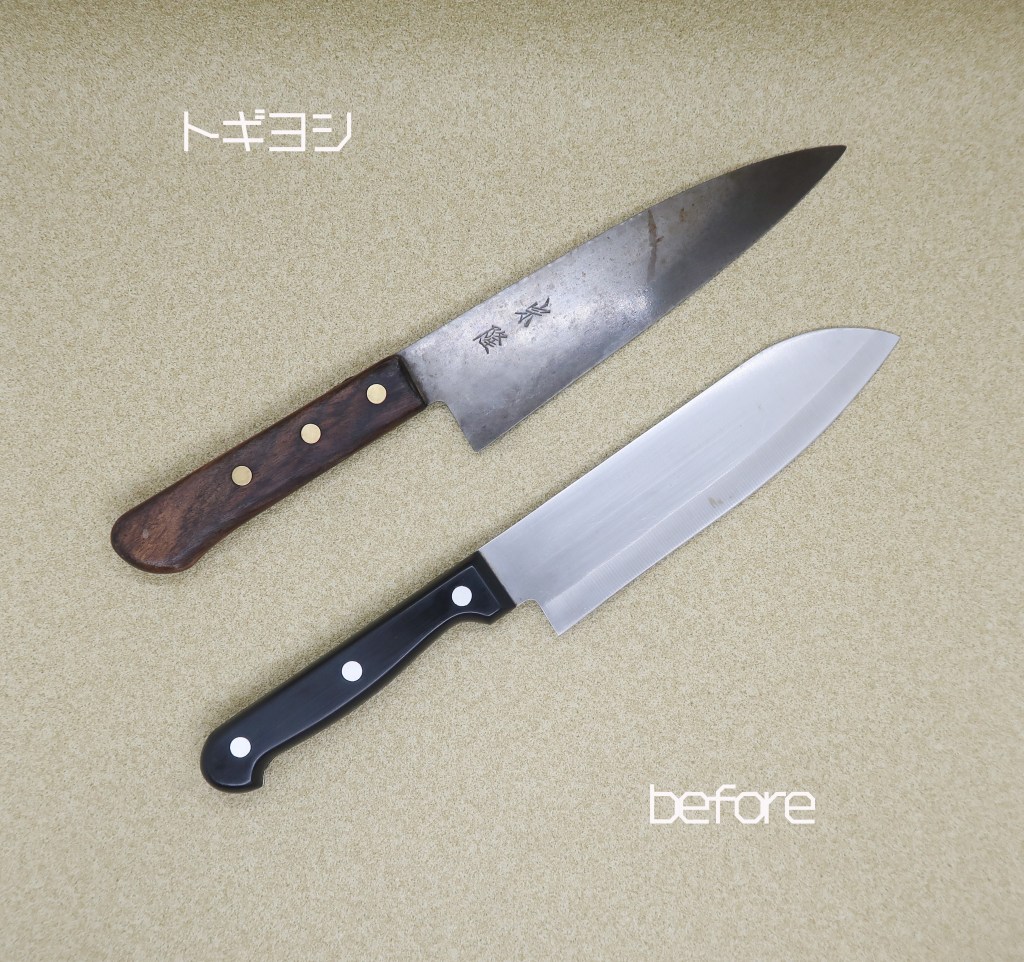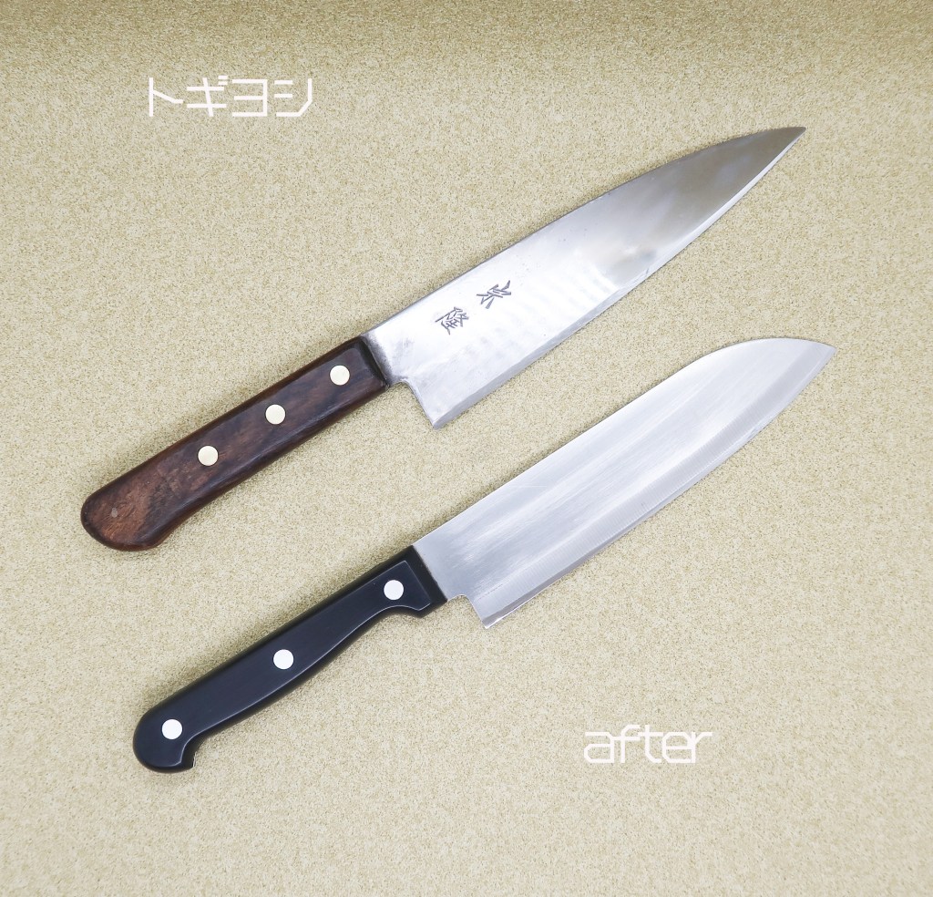 トギヨシの木元です。今日はこの2本を研ぎ上げました。奈良修学旅行土産の定番宗隆の包丁。かなり古くから家にありましたねーとのこと。刃は黒ずんでいますが錆びは深くなく贈られた当時の輝きを取り戻しました。三徳包丁は一般的なステンレス製。ですが歪んでいるのか手前から3センチ位のところが深く削れていたので一旦真っ直ぐに戻して研ぎ上げました。