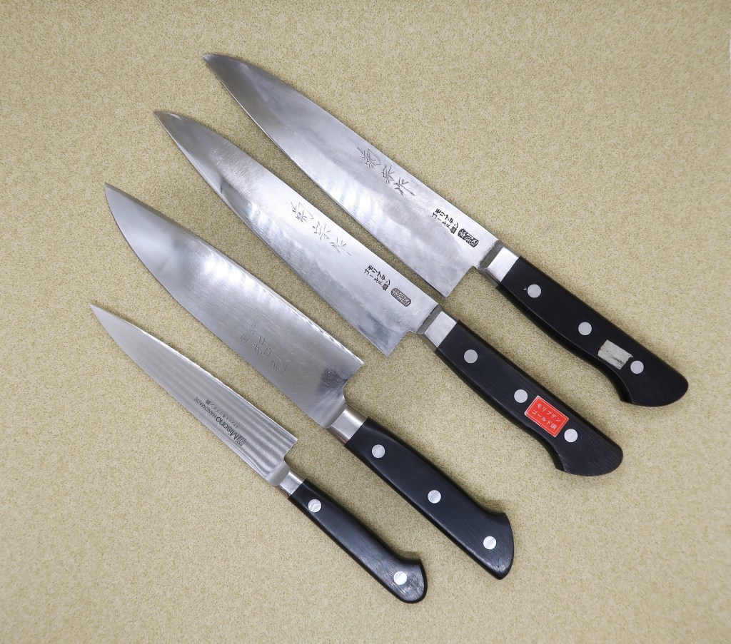 トギヨシの木元です。今日はこの4本を研ぎ上げました。自宅の包丁のメンテナンス。魚を捌いたせいか刃先はガタガタ。研ぎ師の家の包丁とは思えないほど切れませんでした😅😅😅しっかり刃を付け直して復活しました。定期的に研がないとなあと反省