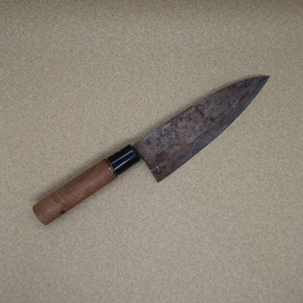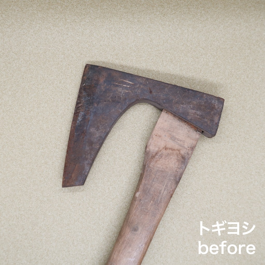 トギヨシの木元です。今日はこの2本を研ぎ上げました。マサカリはどこかの古道具屋で購入されたようでかなり古い品物。まずは錆びand汚れ落とし、CNSへベルブラシで磨きます。その後はスキルタッチ砥石で刃の部分を綺麗に研磨、なるべく錆びの凸凹が無くなるように研磨しました。その後は砥石で頑張って研ぎましたが、重た過ぎてここまでで限界です。本当は柄を外して錆び置換した方が良いのですが…出刃包丁はかなり錆び錆びで綺麗に研ぎ上がるか心配でしたが、その心配が的中、刃の裏側は錆び穴でいっぱい!どこまで研いでも消えないレベル。とりあえず切れるようにはしましたが錆び穴が引っかかるので魚の身がボソボソになるかもしれません。今日は腕が震えています。まだまだだなあ😅
