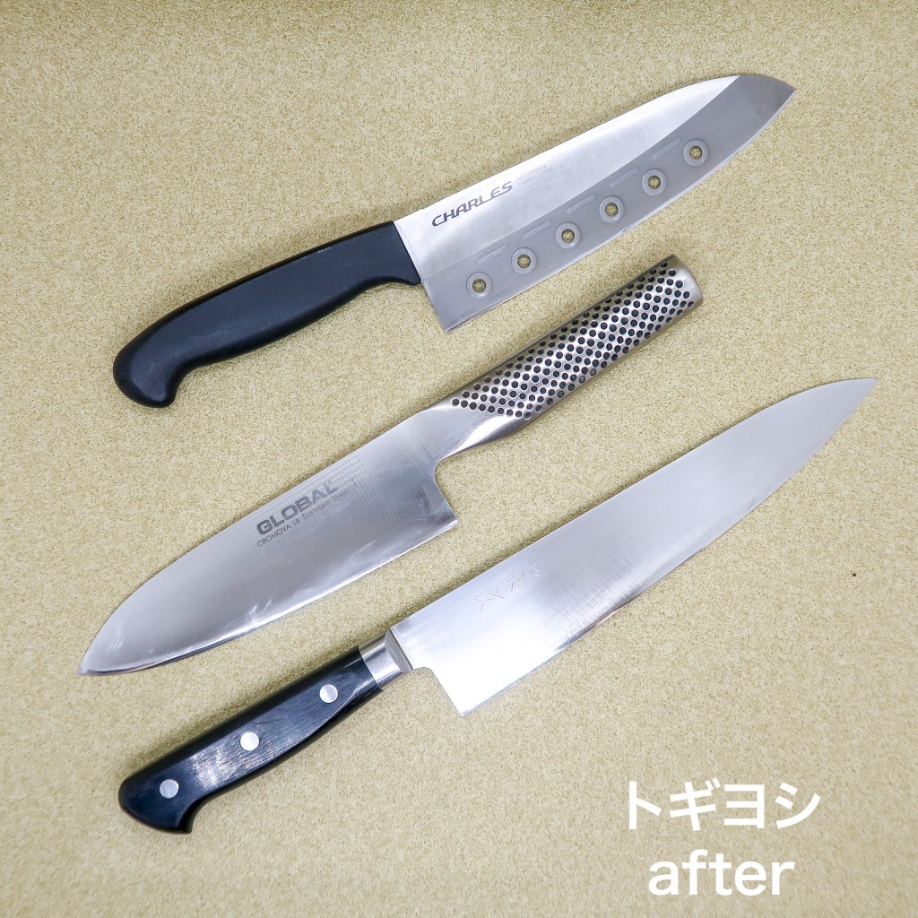 トギヨシの木元です。今日はこの3本を研ぎ上げました。大きい方から宮文の牛刀。細かい欠けが多数ありました。原因は薄く研ぎ過ぎで硬くて脆い刃先がこぼれた感じ、刃先の欠けを落として10~15度の間で小刃を付け直しました。globalの三徳包丁は研ぎに入る包丁の中でも数の多い包丁。比較的刃身が厚めなのでそこをどうするか悩むところ、市内某所で研いだ痕を消して仕上げました。CHARLESの三徳包丁。食材が張り付かないようにする穴が特徴、ただこの穴に食材のカスが残りますので洗う際は注意してくださいね。こちらも細かい欠けが多数あり。数箇所は深かったのでしっかり刃先を落としてから研ぎ上げました。