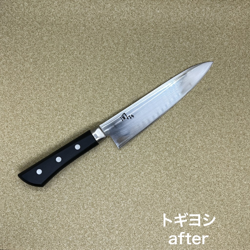 トギヨシの木元です。本日はこの1本を研ぎ上げました。KAI関孫六の牛刀、2度目の研ぎをご依頼いただきました。刃先を確かめた所それほど傷んでおらず、使い方が優しいのかなと思います。いつもの通りしっかり仕上げました。