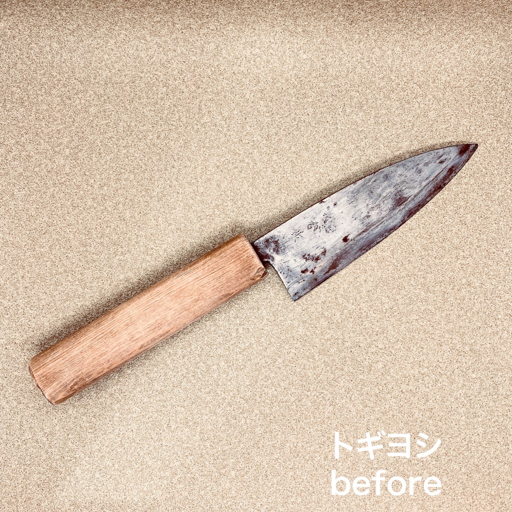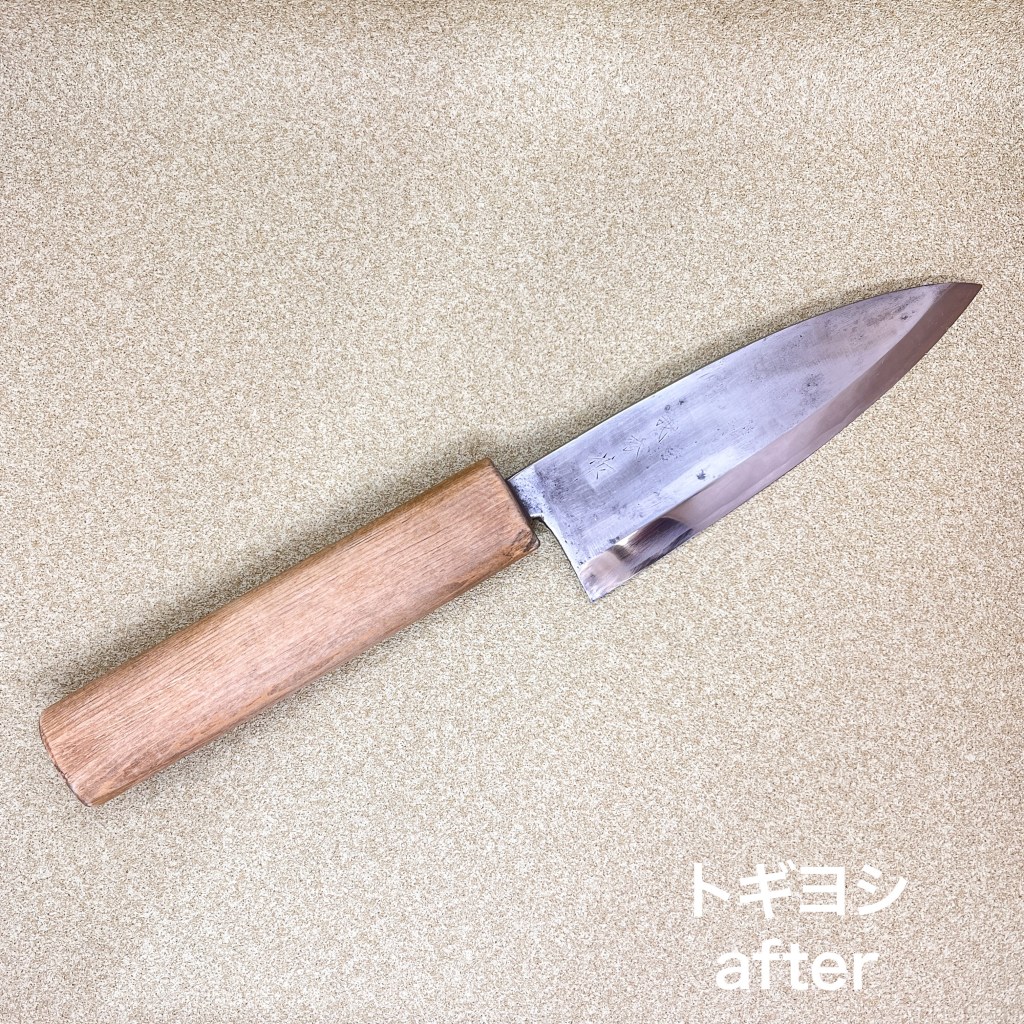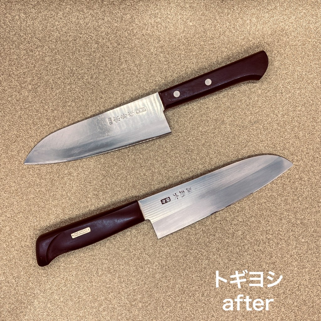 トギヨシの木元です。本日はこの3本を研ぎ上げました。出刃包丁は2年くらい前に研いだモノ。飯寿司シーズンを前に研ぎに出してくださいました。2本の三徳包丁は9月にチラシを配布した地域から研ぎのご依頼。宗房な三徳包丁は反りがあったので手で曲げたら反対側に曲がってしまうほど腰が無くなっていたので元に戻してそーっと研ぎました。関孫六の三徳包丁は薄手のステンレスクラッドタイプ。ステンレスに穴が散見していたので真ん中の鋼に錆びが到達していないか心配でしたが問題ありませんでした。
