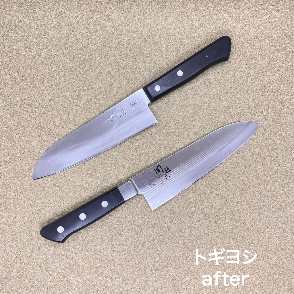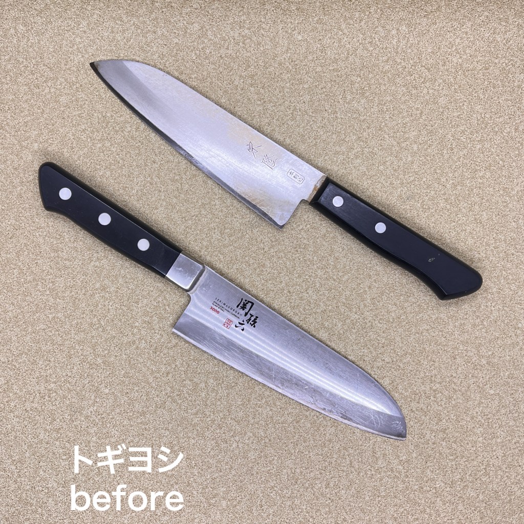 トギヨシの木元です。本日はこの2本を研ぎ上げました。修学旅行の定番みやげ宗隆の包丁と最もポピュラーな関孫六の包丁。表面にちょっと油が蓄積していましたのでインパクトクリーナーで除去。刃先はそこそこ傷んでいましたので荒砥で刃先をリセットしてから研ぎ上げました。