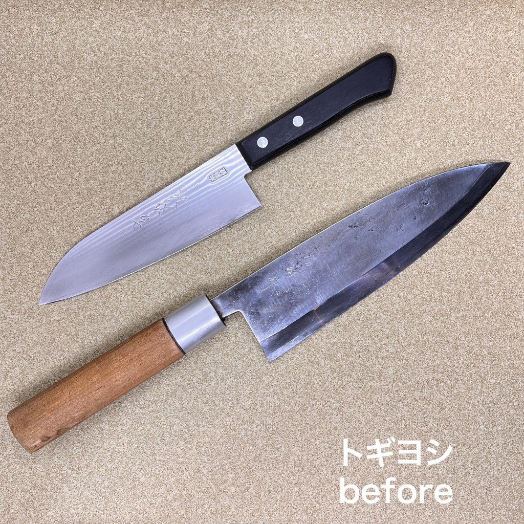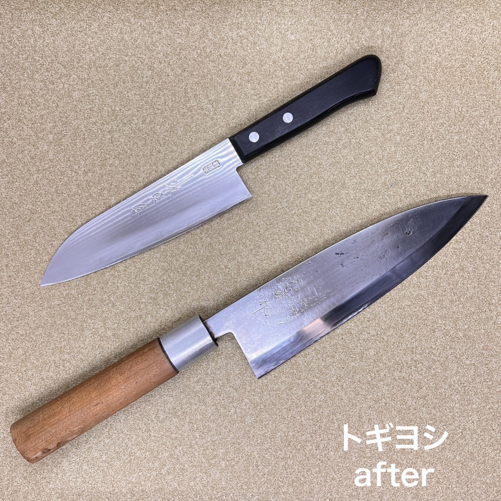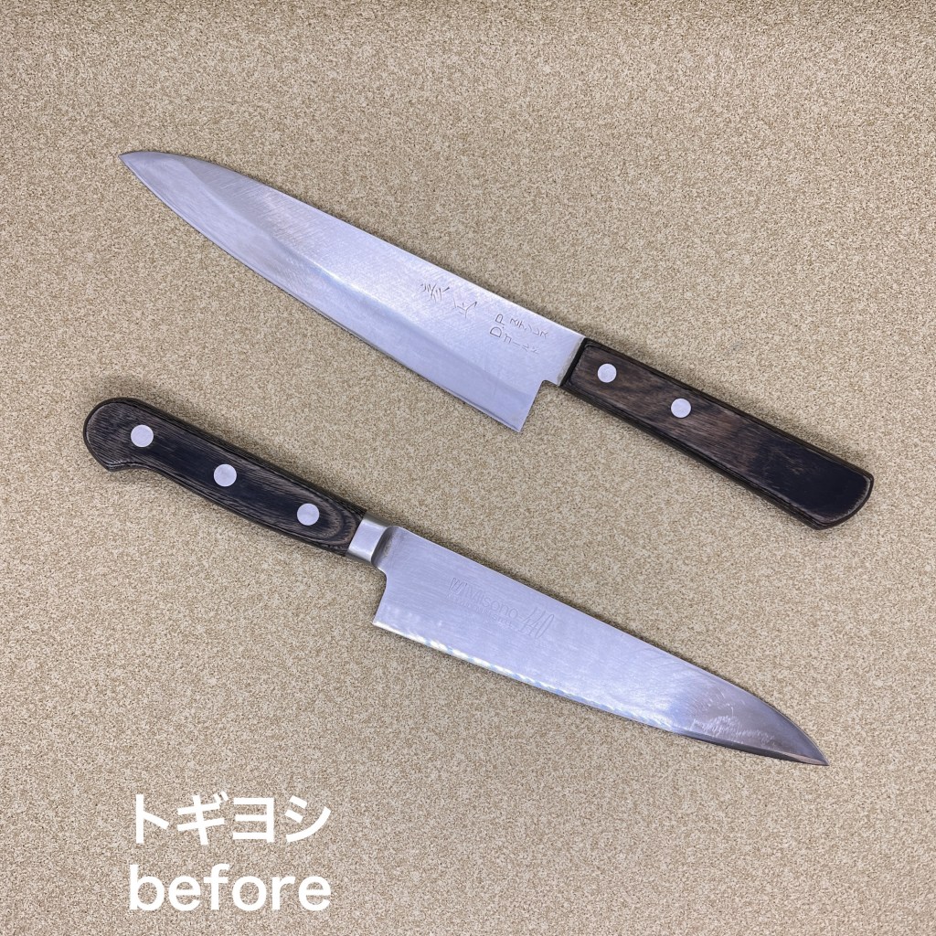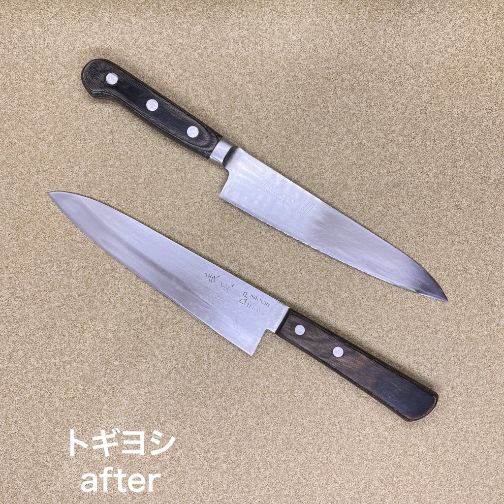 トギヨシの木元です。本日はこの4本を研ぎ上げました。4本ともリピートのお客様。ありがとうございます。勝清の出刃は魚の骨を切ったら欠けてしまったそうです。なので小刃を鈍角に付けて骨に強くなるように仕上げました。吉乃作の三徳包丁は傷みも少なく順調に研ぎ上がりました。彦正の牛刀は特に問題は見当たらなく順調に研ぎ上がりました。ミソノ440の牛刀はだいぶ研ぎ進んで刃幅が狭くなってきました。自分も経験しましたが刃幅が狭くなってくると材質が柔らかくなってくると思ってます。全体に焼き入れされているのでそんなはずはないとは思うのですが実際に研ぎ進むと切れ味がすぐに落ちました。