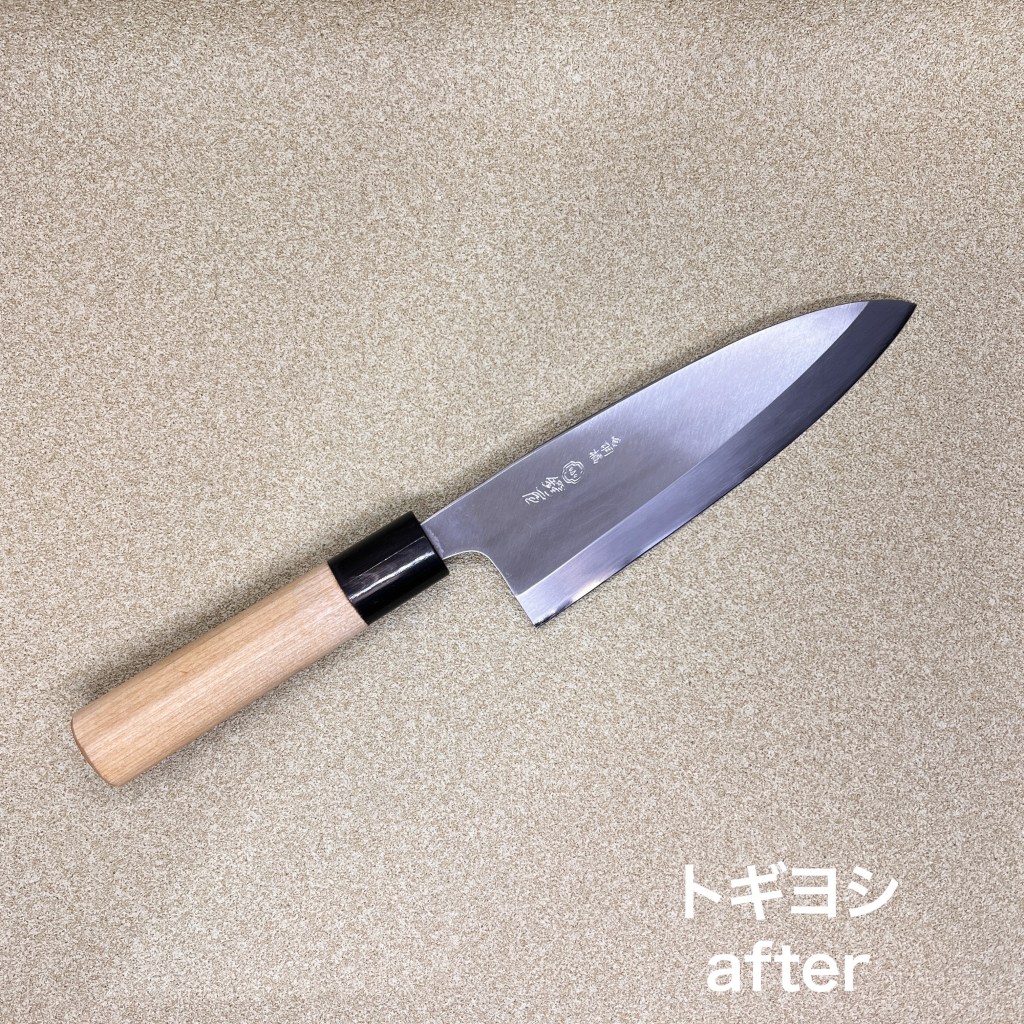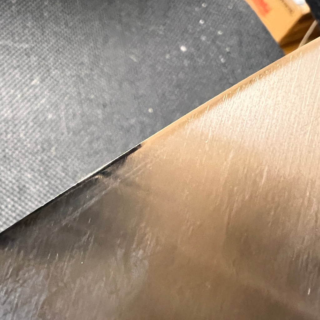 トギヨシの木元です。本日はこの1本を研ぎ上げました。ほぼ新品の出刃包丁。東京鍔屋製。つばやと読むのですね。つばが読めませんでした🤣🤣一見ではそれほど傷んでいないように見えますが細かい欠けがありました。小刃をリセットして新しい小刃を付け直しました。