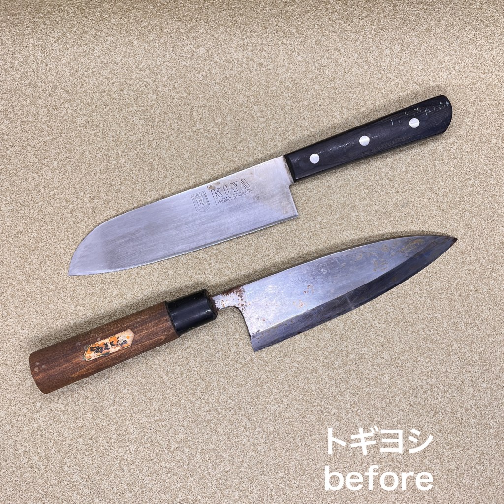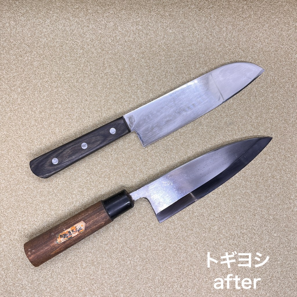 トギヨシの木元です。本日はこの2本を研ぎ上げました。リピートのお客様、ありがとうございます。この時期鮭をたくさん切るので出刃を研いで欲しいとのことでご依頼いただきました。欠けは全くないので小刃をしっかり付けて欠けに強くしました。木屋の三徳包丁は油汚れが蓄積していたのでまずは汚れ落としから始めて研ぎ上げました。
