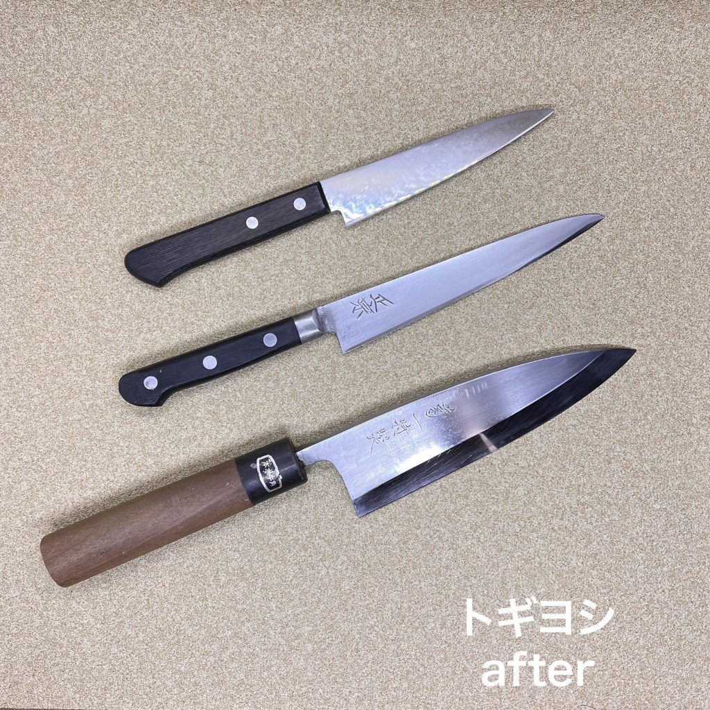 トギヨシの木元です。本日はこの3本を研ぎ上げました。リピートのお客様、いつもありがとうございます。菊一の出刃包丁。大きな傷みはありませんでしたので順調に仕上がりました。正本のペティは錆び、汚れで黒く変色していましたがゴム砥石で簡単に落ちました。鋼の包丁なので日々のメンテナンスが大事です。NBのペティ?果物ナイフ?は柔らかめなので力を込めすぎて湾曲しないように保持して研ぎ上げました。