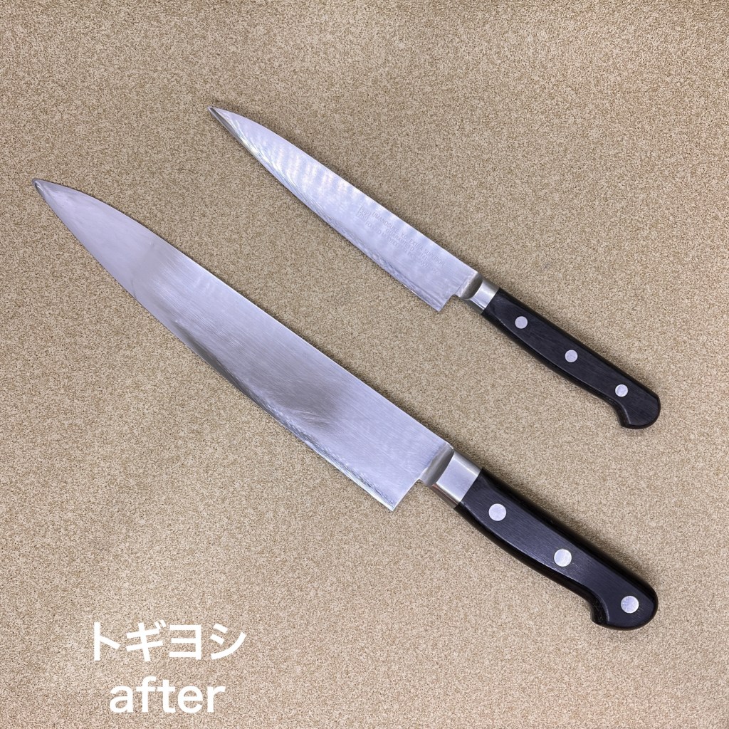 トギヨシの木元です。本日はこの2本を研ぎ上げました。UNANOSUKEの牛刀とペティの研ぎをご依頼いただきました。だいぶ研ぎ進んでいて刃身が厚くなっていましたので少し刃身を落とすために角度を10度くらいを目処に切刃を作り研ぎ上げました。 トギヨシでは研ぎの依頼をお待ちしています。