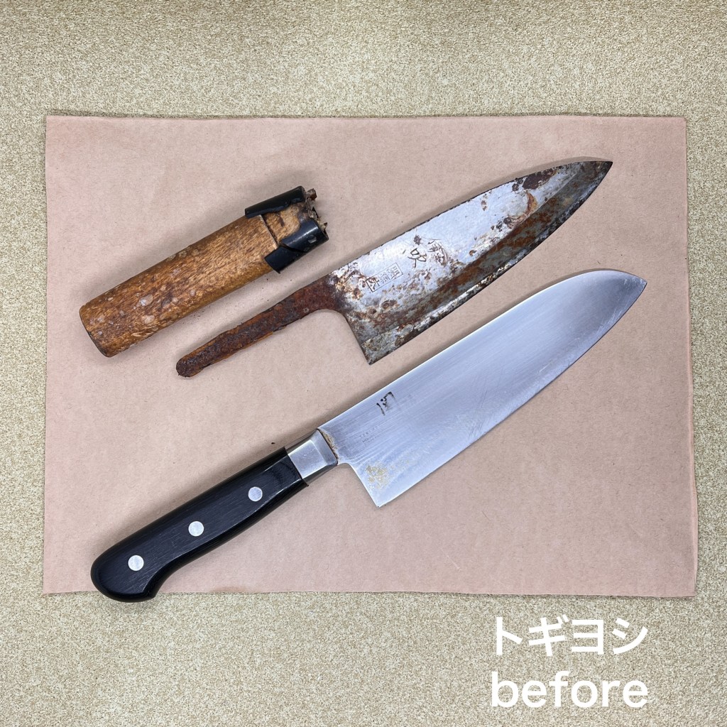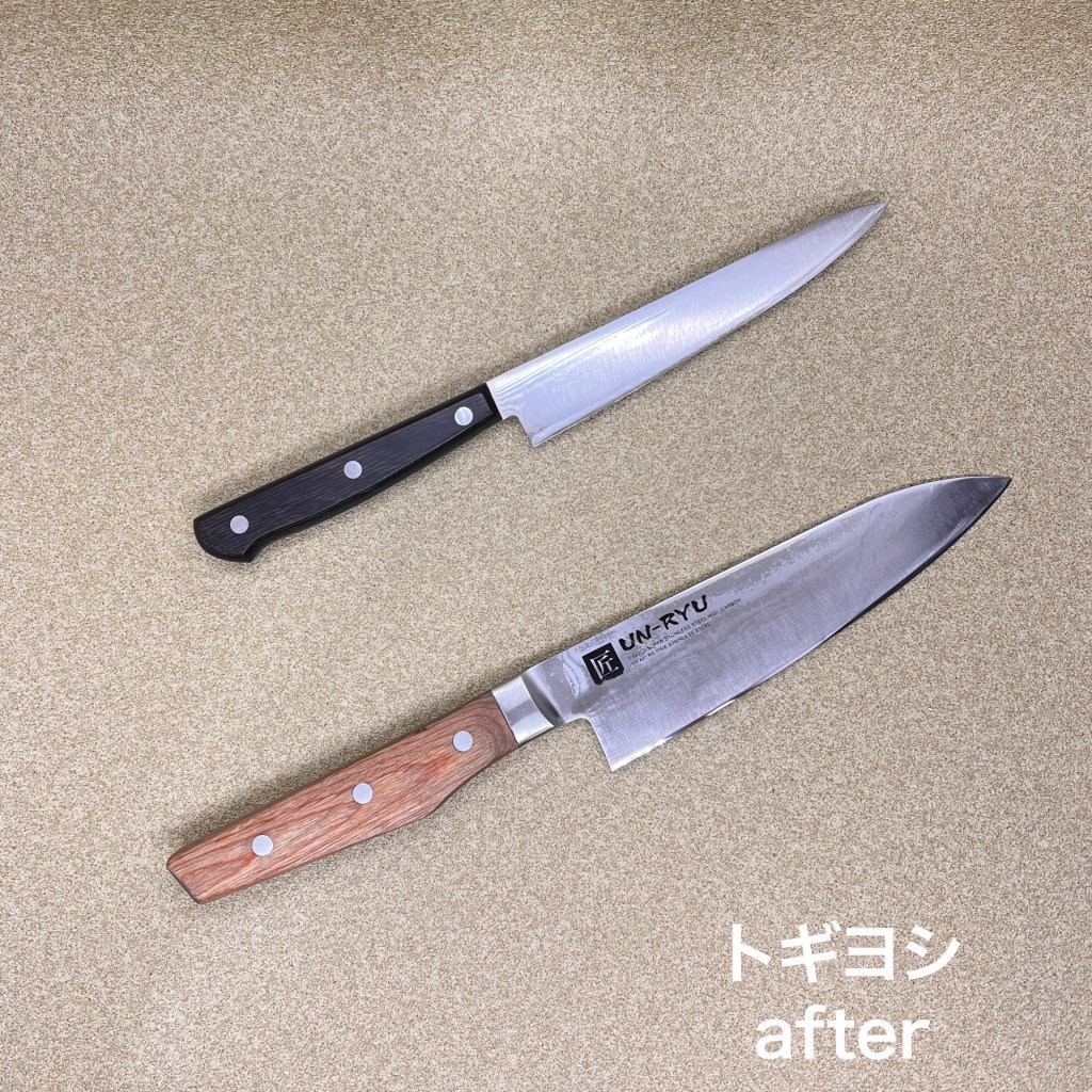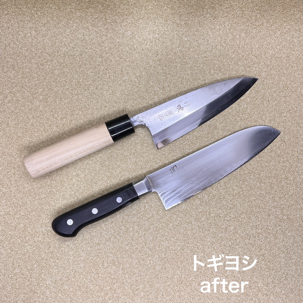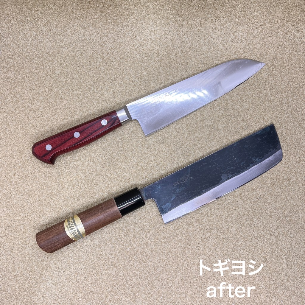 トギヨシの木元です。本日はこの6本を研ぎ上げました。伊吹の小ぶりな出刃包丁、柄が大きく割れていたので交換、刃も研ぎ進んで急角度になっており20度に戻すのにだいぶ落としました。キレイになったでしょ😉宮文の三徳と菜切りはリピートのお客様、文太郎は材質がかなり硬いと思います。鋼の菜切りも鋼が硬く良い仕上がりになりました。宮文のペティと雲龍の牛刀は刃先もそれほど傷んでおらず順調に仕上がりました。トギヨシでは研ぎの依頼をお待ちしています。