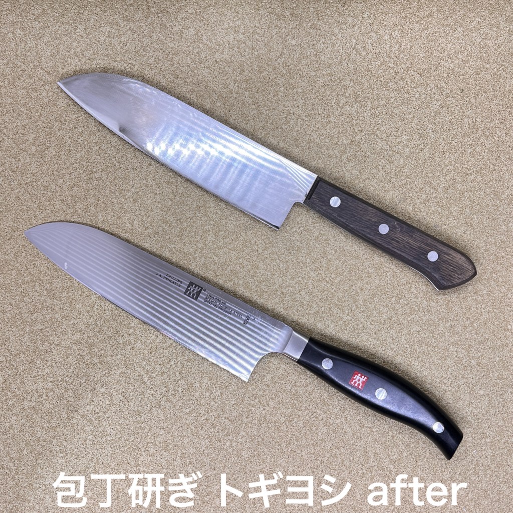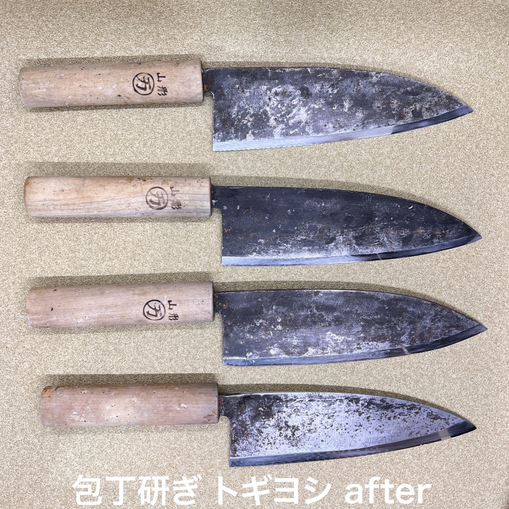 トギヨシの木元です。本日はこの7本を研ぎ上げました。得意な加工出刃!水産加工場で使われている包丁。同じサイズの出刃包丁に比べて1/3の重さ。加工しているのは女性が殆どなので軽い包丁が求められたようです。一本だけ研ぎ進んで形が崩れていましたが整えました。錆びは見た目ほど深くなくて助かりました。小ぶりな出刃包丁は木屋の団十郎というブランド。多分昭和時代のものらしいです。表はあまり錆びていませんが裏の刃先か錆びていて研いでも錆び穴が残りました。4mmほど刃先を落とせば錆びは無くなりますが料金がアップするのでお客様に次回はということでお伝えします。トギヨシでは研ぎの依頼をお待ちしています。
