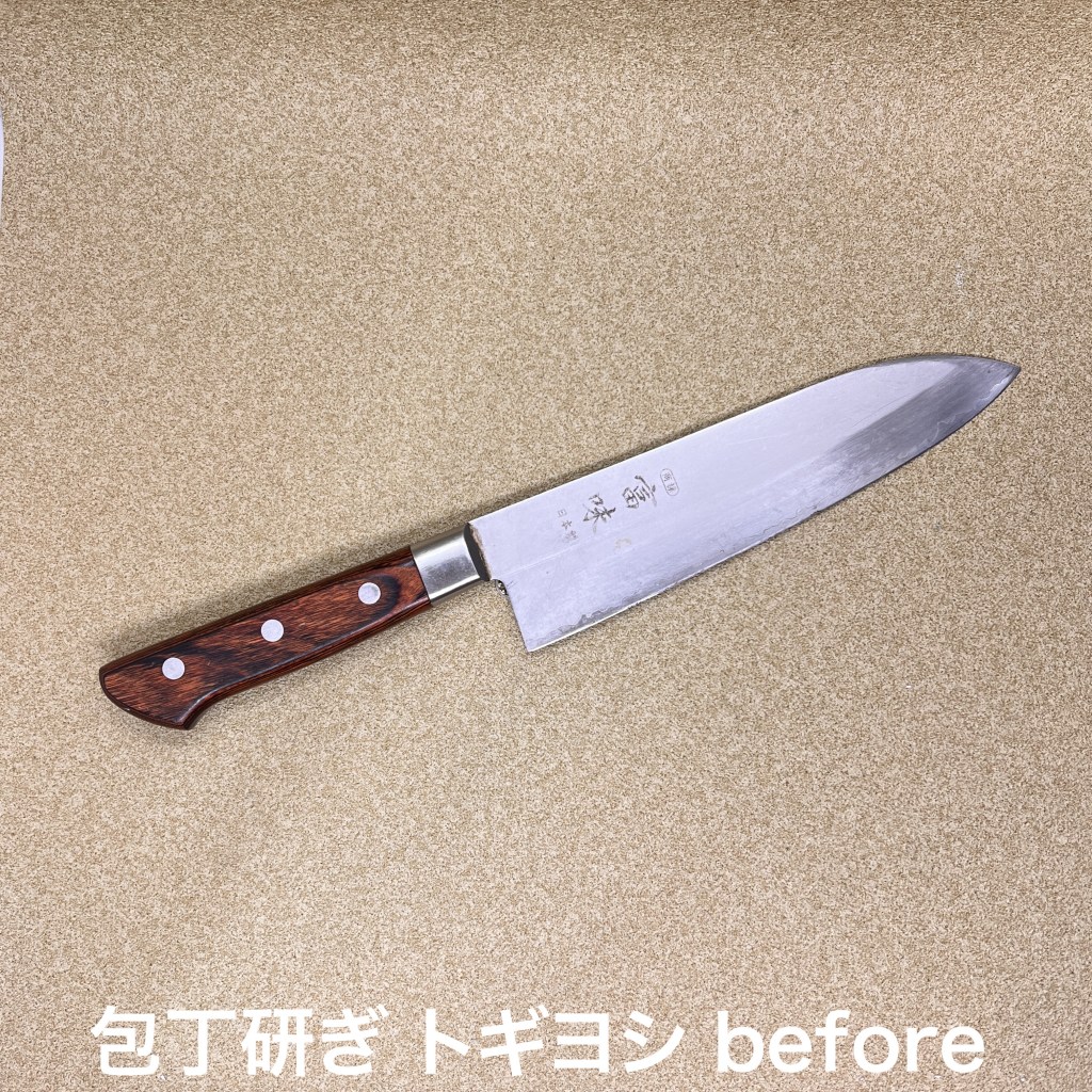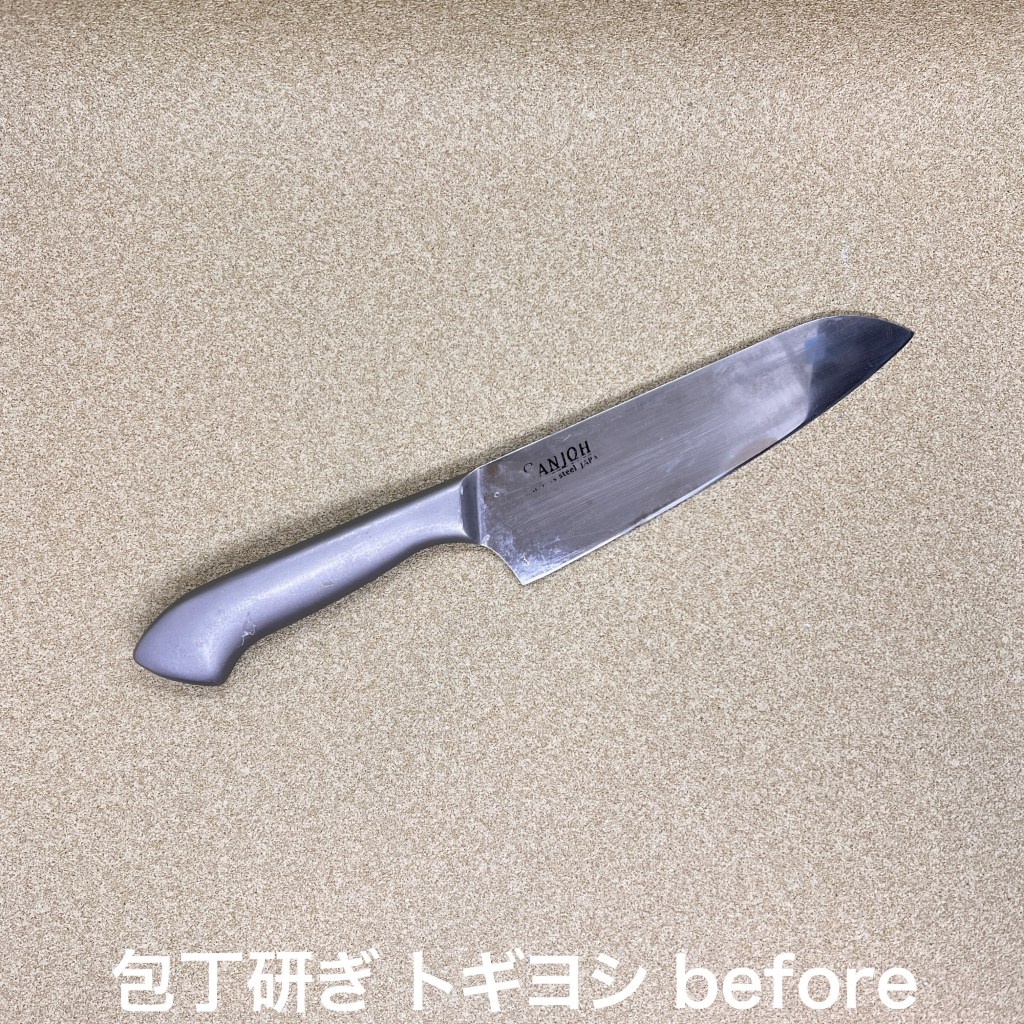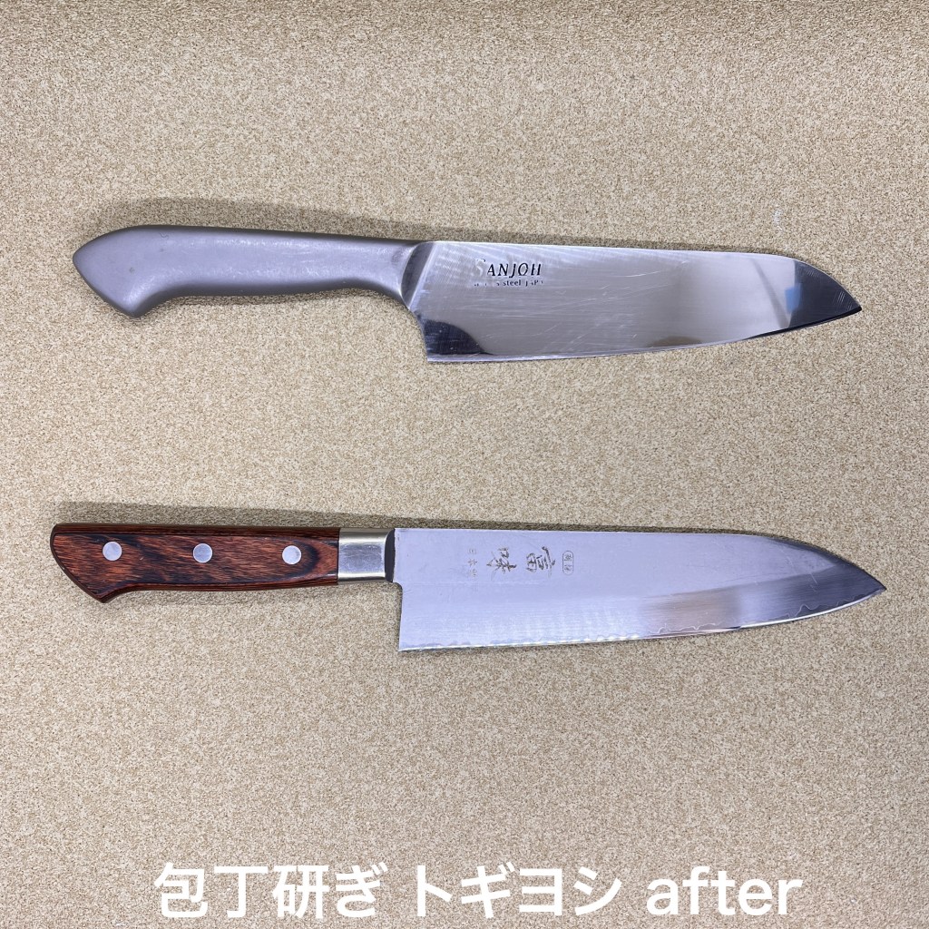 トギヨシの木元です。本日はこの2本を研ぎ上げました。富味の牛刀はまあまあ大きめの欠けが数ヶ所あり刃先を落として欠けを無くしてから研ぎ上げました。SANJOHの三徳包丁は他所で研がれたようで片刃になっていたのとカエリが残っていたので、こちらも刃先をリセットして研ぎ上げました。トギヨシでは研ぎの依頼をお待ちしています。