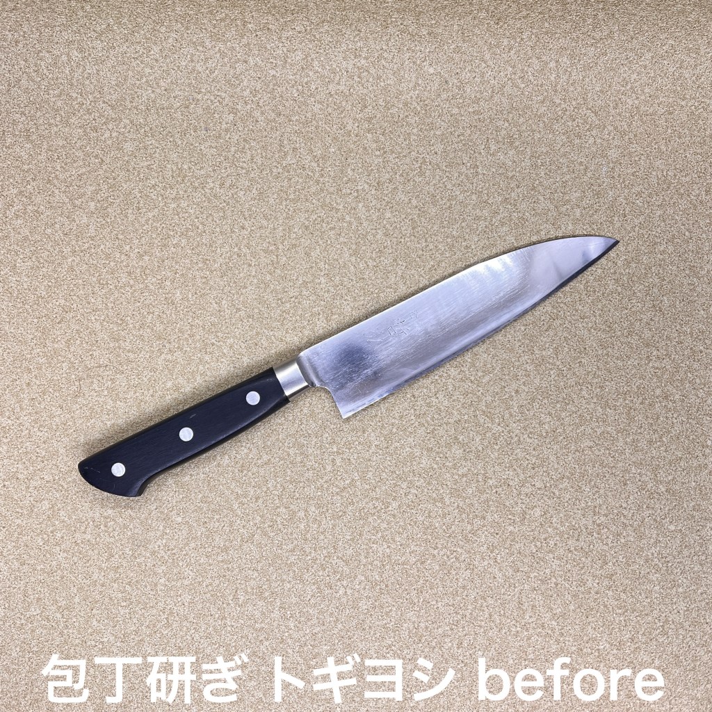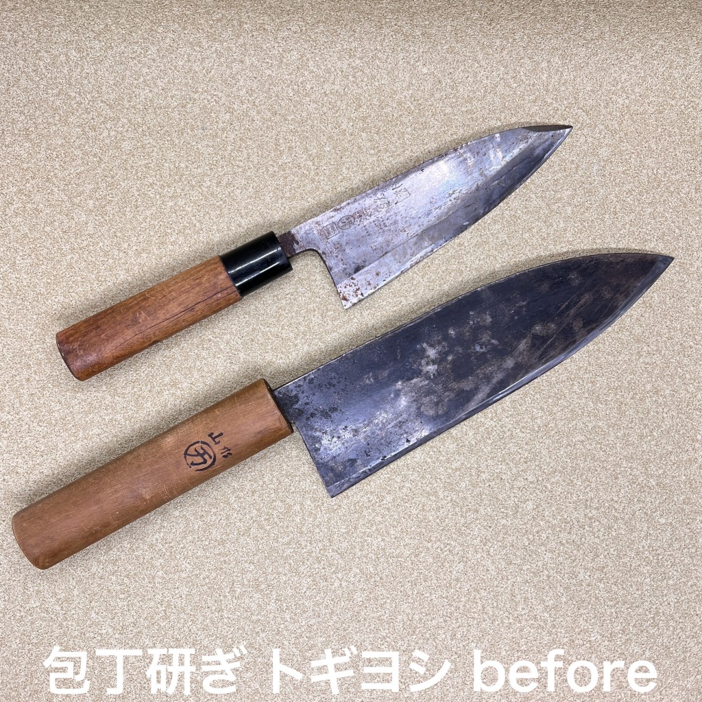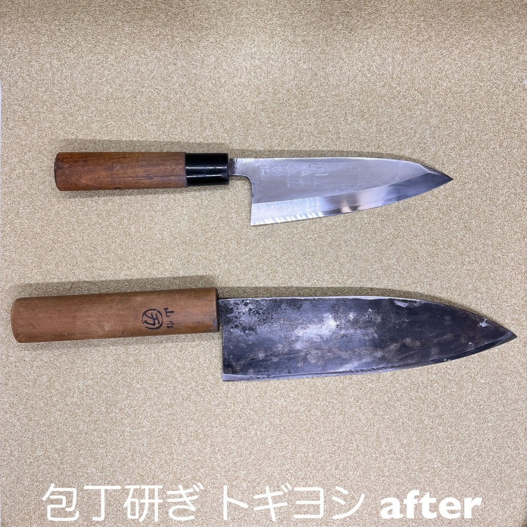 トギヨシの木元です。本日はこの3本を研ぎ上げました。哲弘の三徳包丁は自家用。ゴボウを切ったせいで切れなくなりましたので研ぎ直しました。これで長ネギもサクサク切れます。関孫六の出刃包丁とマルマン佐藤の加工出刃は背がボコボコに叩いた痕が痛々しい状態。まずディスクグラインダーで背を綺麗にしてから研ぎ上げました。加工出刃は刃先がカーブしているので研ぐのが難しいのですトギヨシでは研ぎの依頼をお待ちしています。