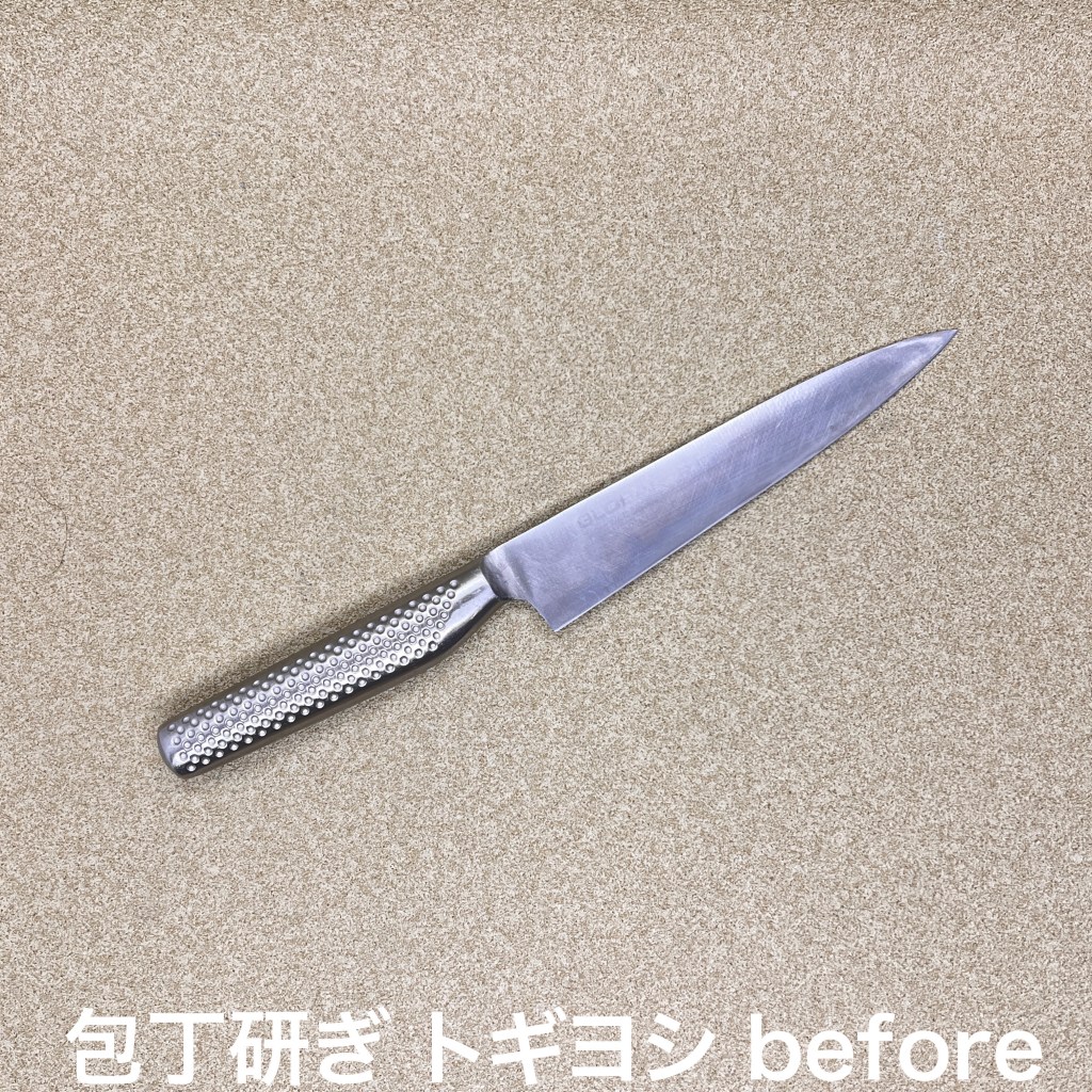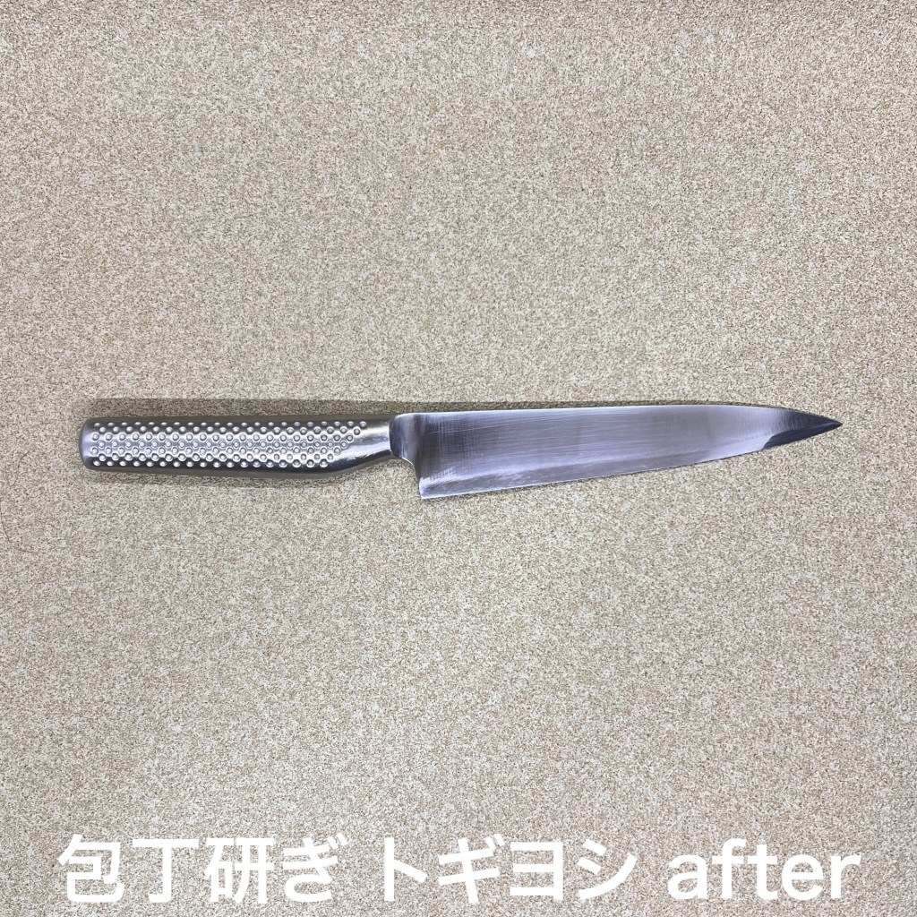 トギヨシの木元です。本日はこの1本を研ぎ上げました。GLOBALのペティナイフ。刃身が少し厚かったので鋭角で切り刃を作って仕上げました。全体的に砥石に当てたのかくすんでしましたので、ブランド名は消えてしまいますが全面磨きました。キレイになったでしょトギヨシでは研ぎの依頼をお待ちしています。