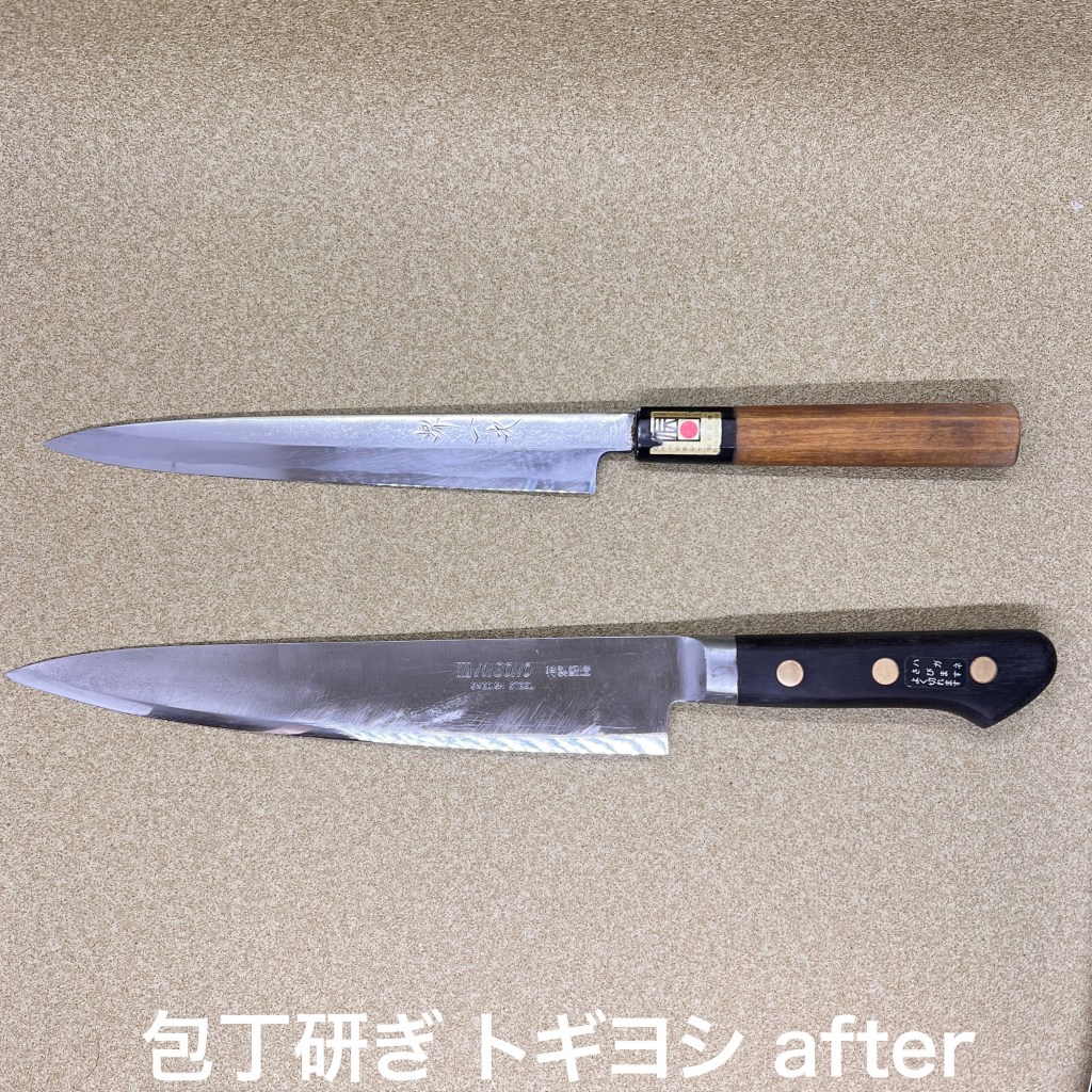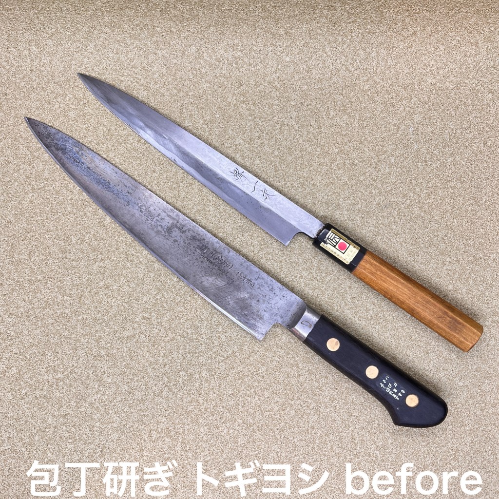トギヨシの木元です。本日はこの2本を研ぎ上げました。左利き用の包丁達。ミソノの牛刀はスウェーデン鋼製。日本の鋼にも負けない切れ味が特徴。スウェーデン鋼は高水素含有鋼で硬さと粘りがあり、耐摩耗鋼として産業用に使われてます。堺一次の柳刃はいい感じに研がれていましたが、切刃全面がフラットにはなっておらずそこから直しました。片刃の包丁は切刃の幅が広いのでいくら研いでもなかなか刃先まで砥石が当たらずどうしても包丁を立て気味にしてしまい二段刃になりがち、そうなると切れ味が良くなりません。トギヨシでは研ぎの依頼をお待ちしています。