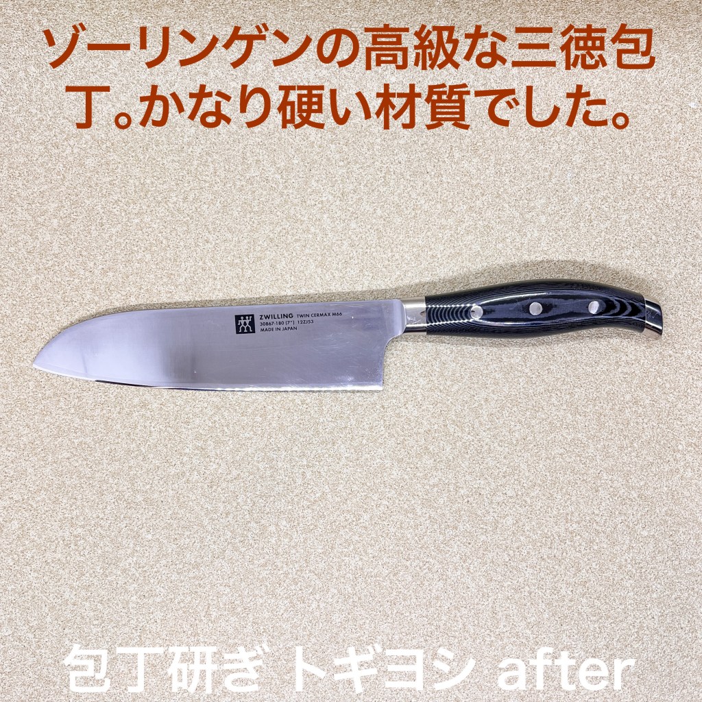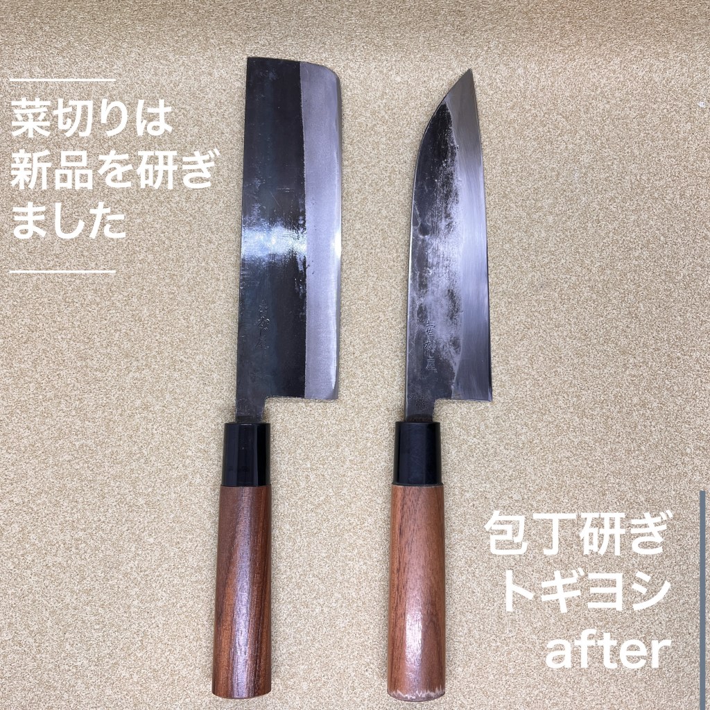 トギヨシの木元です。本日はこの4本を研ぎ上げました。土佐のかじ屋の包丁は鋼が硬いことで有名。実際硬かったのですが、仕上げに少々時間がかかりました。ゾーリンゲンの高級な三徳包丁はとても硬い材質。中砥では滑る感触でしたが仕上げ研石G1ではしっかり砥石に吸い付く感じで良い仕上がりになりました。KAIの小さな三徳包丁は刃渡140ミリ。リピートのお客様。中砥まで来たら先端近くに錆び穴が出現!1ミリほど刃先を落とさなくてはならず、刃身も厚くなったので一から切刃を作り直して研ぎ上げました。一段と切れるようになったと思いますトギヨシでは研ぎの依頼をお待ちしています。