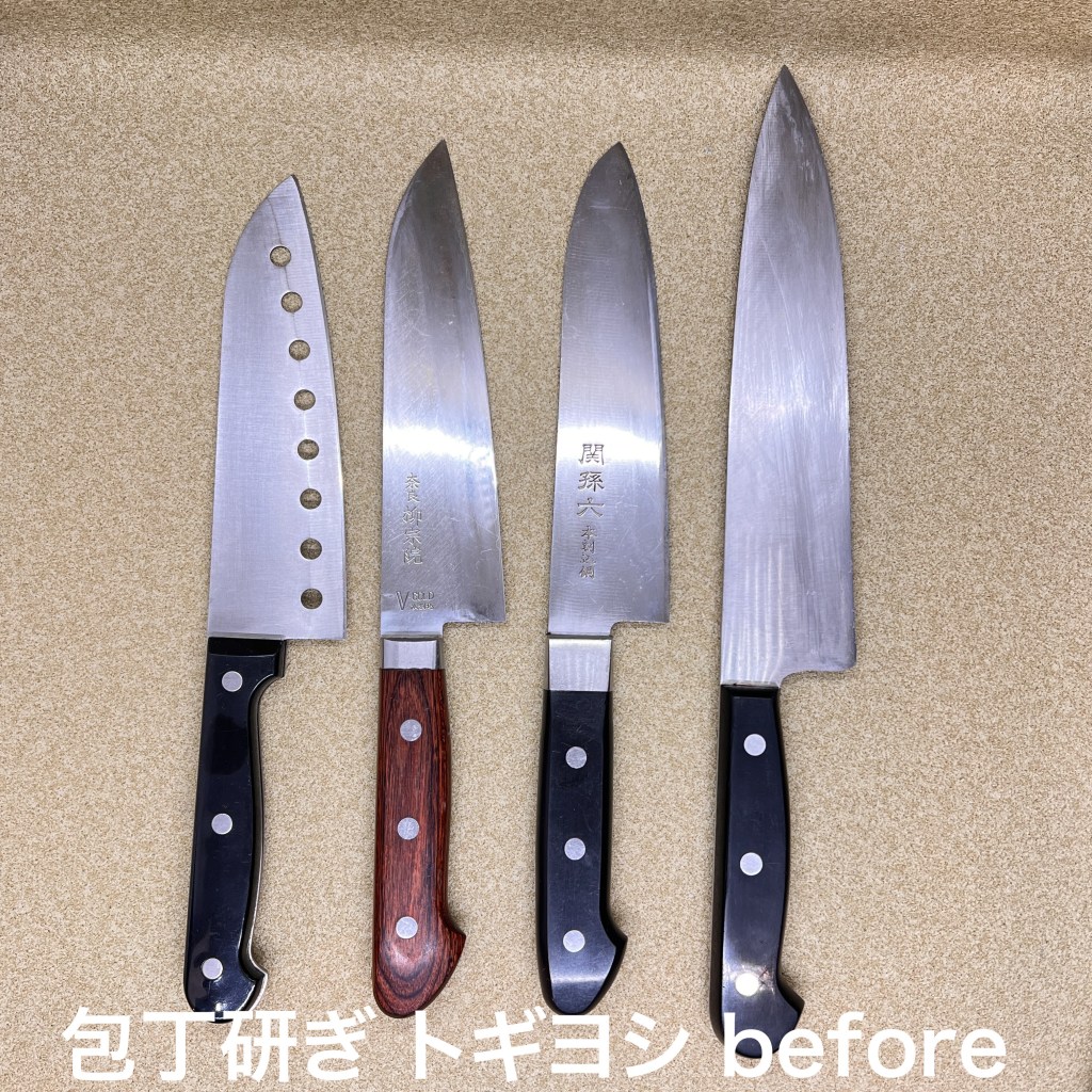 トギヨシの木元です。本日はこの4本を研ぎ上げました。哲宗の三徳包丁は食材がくっ付かないように穴が空いたタイプ。一度研いでいるので順調に研ぎ上がりました。奈良柳宗院の三徳包丁は奈良への修学旅行のお土産の定番、だいぶ研ぎ進んでいます。次回は刃身を落として芯の鋼を出したいですね。関孫六の三徳包丁刃身が厚いので落として切りやすくなったと思います。#1000の耐水ペーパーで磨いて丁度良い感じの霞になりました。大ぶりな牛刀は表面が深い傷が多数あったので3Mへベルパープルで傷を消してから研ぎました。トギヨシでは研ぎの依頼をお待ちしています。