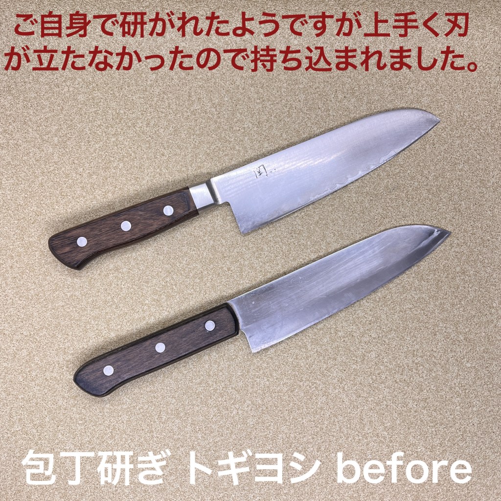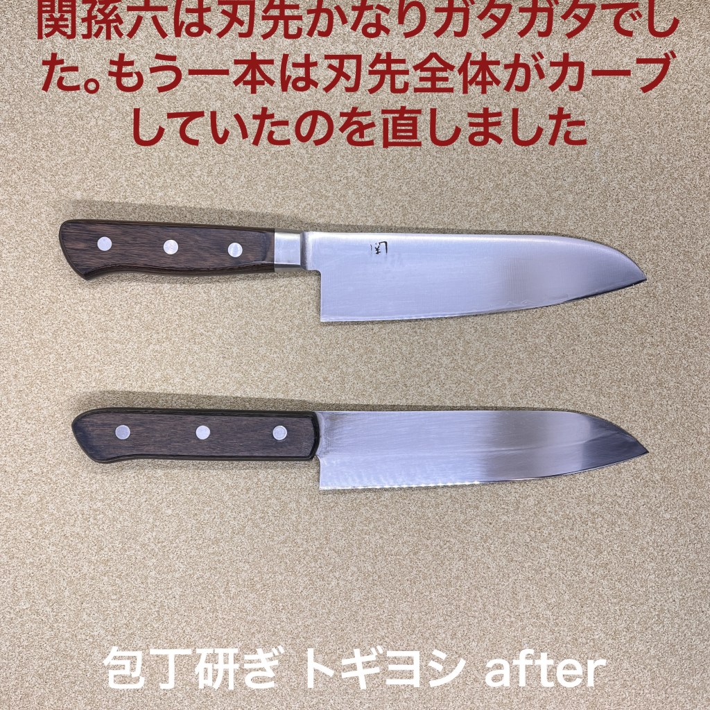 トギヨシの木元です。本日はこの2本を研ぎ上げました。関孫六の三徳包丁は刃先がかなりガタガタでしたので刃先をリセットして研ぎ上げました。波紋ギリギリまできているので次回は刃身を落とさなくてはなりませんね。もう一丁の三徳包丁は刃先全体がカーブしていて包丁として使い難くなっていましたので刃先にフラットな部分を作り直すのと、刃身がかなり厚かったので落としています。トギヨシでは研ぎの依頼をお待ちしています。