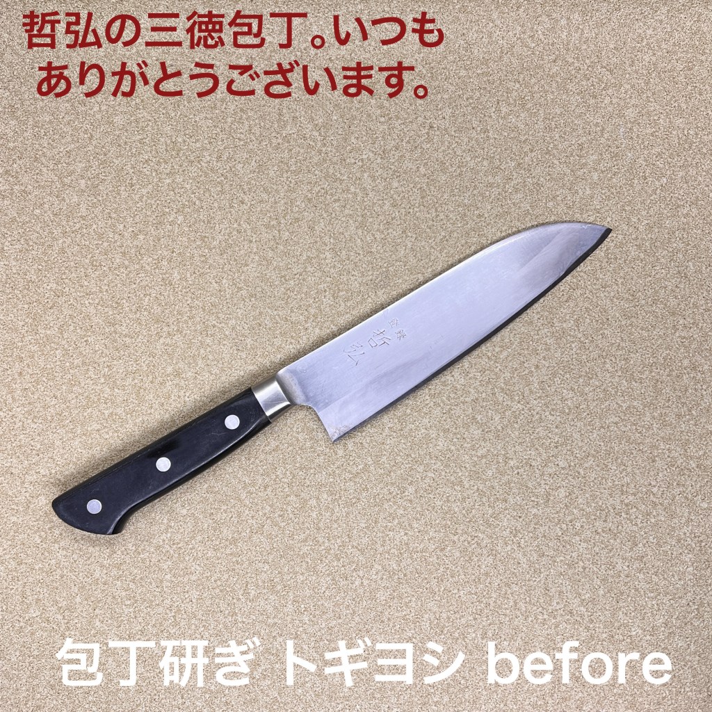 トギヨシの木元です。本日はこの1本を研ぎ上げました。哲弘の三徳包丁は旭川の中野特殊刃物工業オリジナル。鋼は青紙を使った各所にこだわりの詰まった包丁。刃先は多少痛みはありますが大きな損傷は無く順調に仕上がりました。鋼の黒ずみはどうしても発生しますので、気になる方はゴム砥石で磨いてください。我が家も哲弘を使っていますが少し黒ずみが出たらゴム砥石で磨いています。トギヨシでは研ぎの依頼をお待ちしています。