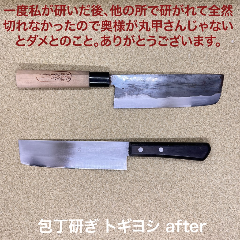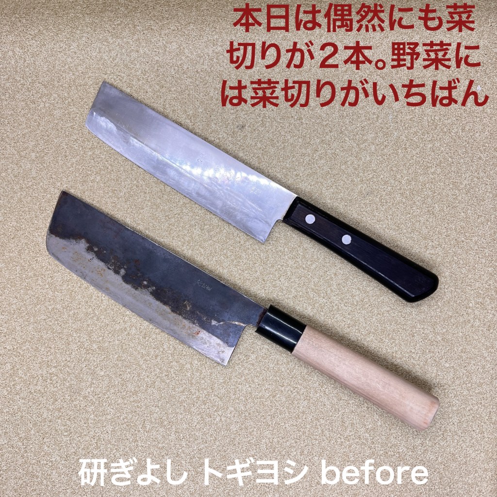 トギヨシの木元です。本日はこの3本を研ぎ上げました。勝清の菜切りは一度自分が研いでいますが、その後他所で研いで全然切れず丸甲さんじゃないとダメとのこと。ありがとうございます。今回もバッチリ仕上げました。源爲久作の菜切りもリピートのこの客様。ありがとうございます。少し表面が凹凸があるように見えたのでフラットに仕上げました。両方ともキレイになったでしょ!トギヨシでは研ぎの依頼をお待ちしています。