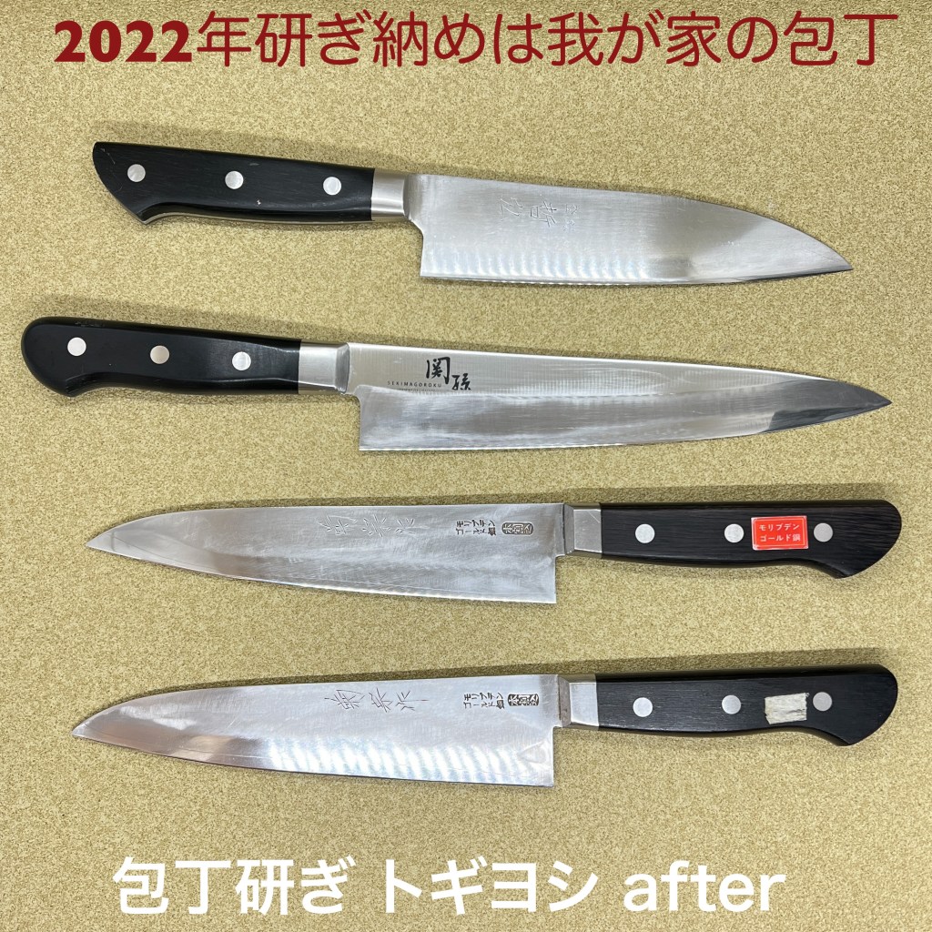 トギヨシの木元です。2022年の研ぎ納めは4本を研ぎ上げました。我が家の包丁たち、朝食を作っていて長ネギの切れ味が良く無かったので研ぎ納めにしました。頻繁に研いでいるので荒砥ば使わず中砥からで充分研げます。砥石の上でチリチリと音がしたので、刃先が傷んでいたのが確認できました。来年もトギヨシでは研ぎの依頼をお待ちしています。今年も多くの包丁研ぎをご依頼頂きまして誠にありがとうございます。皆様良い年を迎えください。