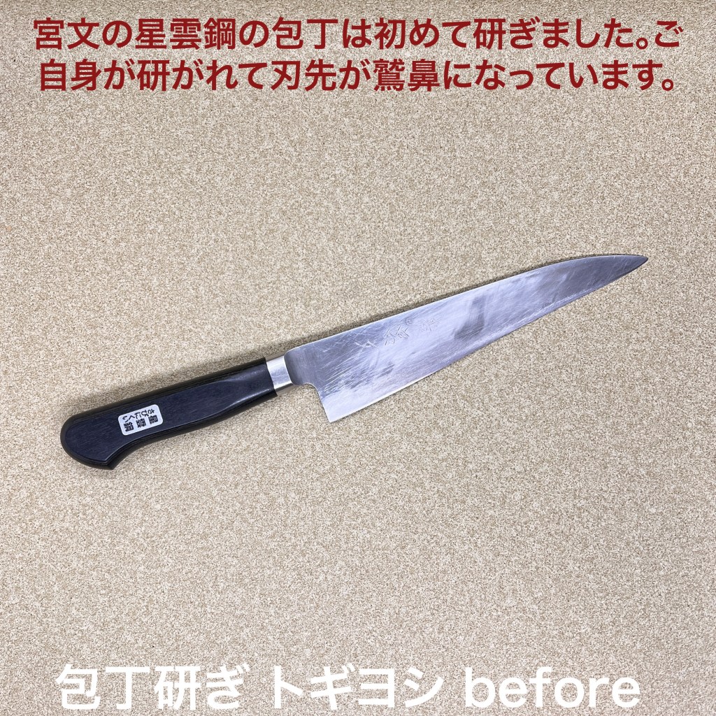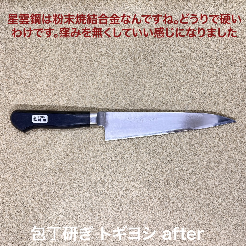 トギヨシの木元です。今日はこの1本を研ぎ上げました。宮文の星雲鋼の牛刀。ご自身で研がれて刃先が鷲鼻になってしまいました。これは包丁を反らして砥石に当てた時になる現象。加えて片刃研ぎになっていました。クラッドですが波紋が全く見えていませんのて芯の鋼が出ていたのか微妙でした。とことん牛刀の形に持っていくと包丁が短くなるので、元の形を維持しつつ研ぎ上げましたこトギヨシでは包丁研ぎの依頼お待ちしております。