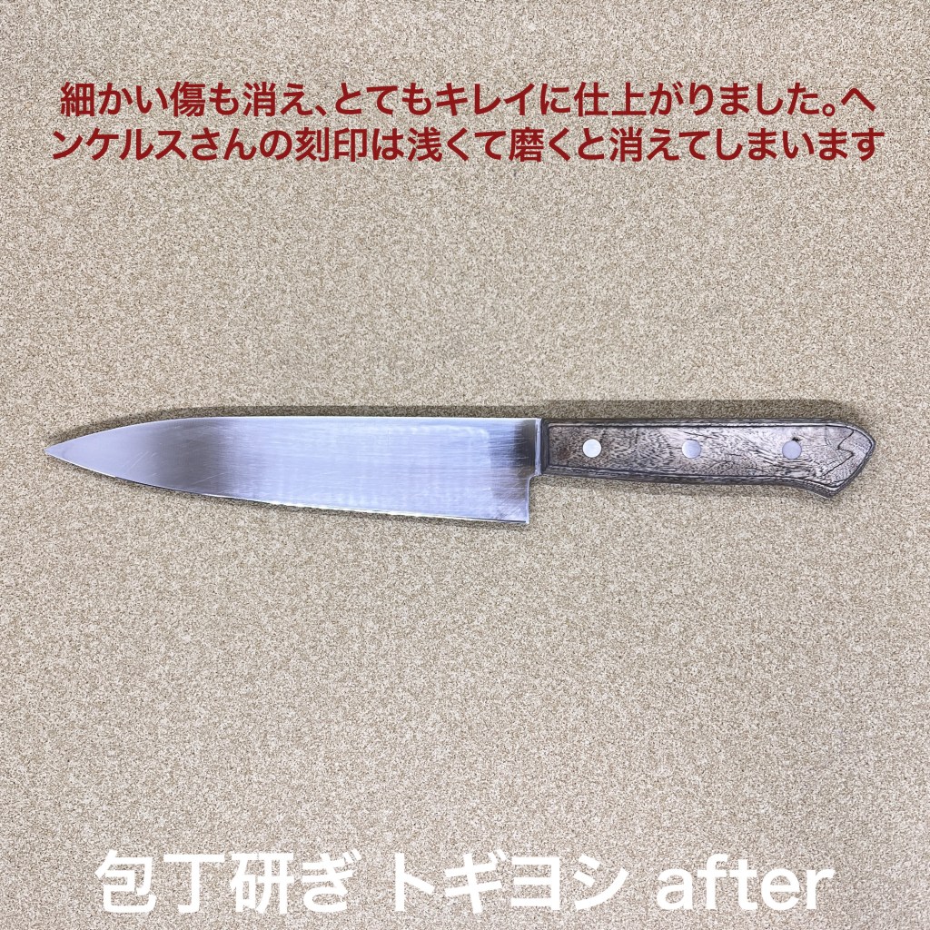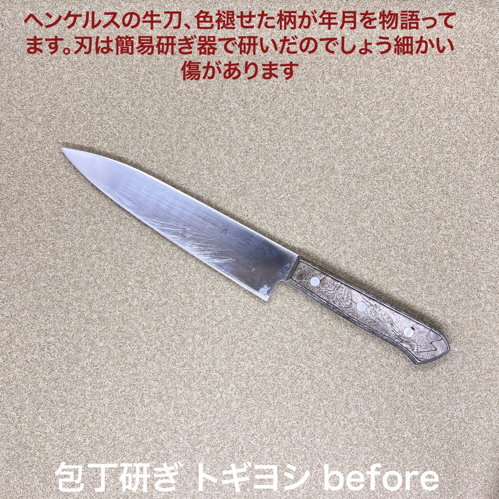 トギヨシの木元です。今日はこの1本を研ぎ上げました。ヘンケルスの牛刀。柄の色が落ちているのでかなり永く使われているか、食洗機に入れている可能性がありますが刃の硬さは維持されています。細かい傷があったので簡易研ぎ器を使われていたのかな?仕上げでチリチリと音が出ていました。細かい傷は中砥で充分落とせ、仕上がりはバッチリです。トギヨシでは包丁研ぎの依頼お待ちしております。