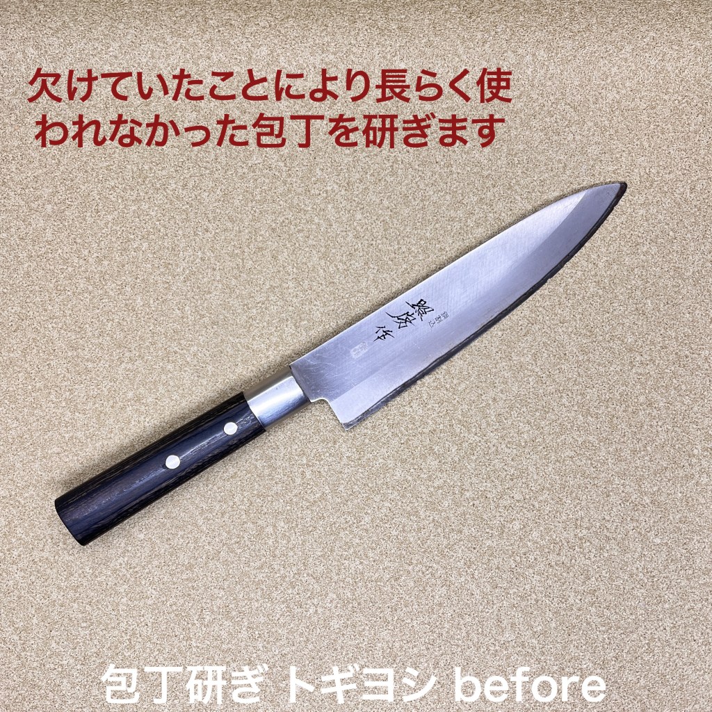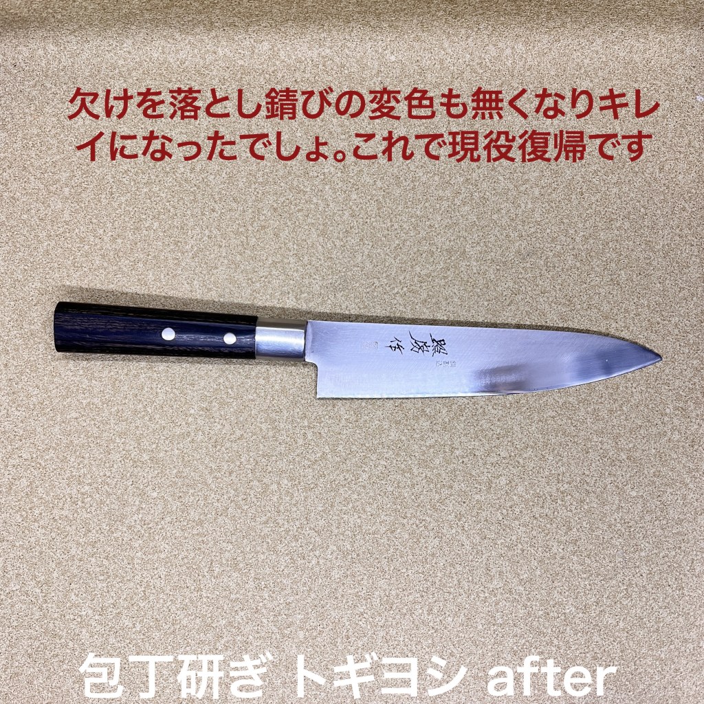 トギヨシの木元です。今日はこの一本を研ぎ上げました。照房の牛刀。欠けていたため長らく使われず仕舞われていた包丁。もったいないので研いだら使えますか?とのお問い合わせをいただきまして拝見したら錆びの影響が深くなければ大丈夫という事で研ぐことに。欠けは結構深くて#120でガリガリ落としました。切刃に少し錆び穴が残りましたが刃先には影響なかったのて助かりました。