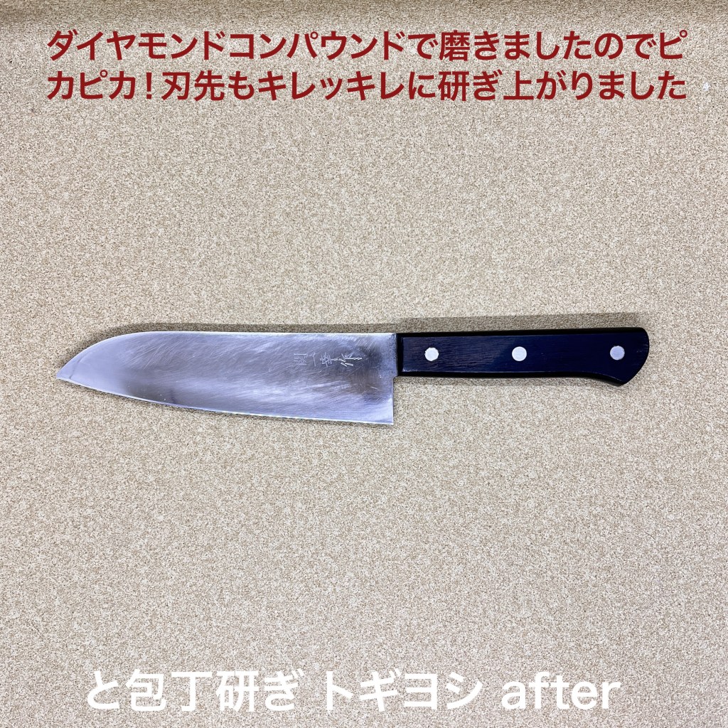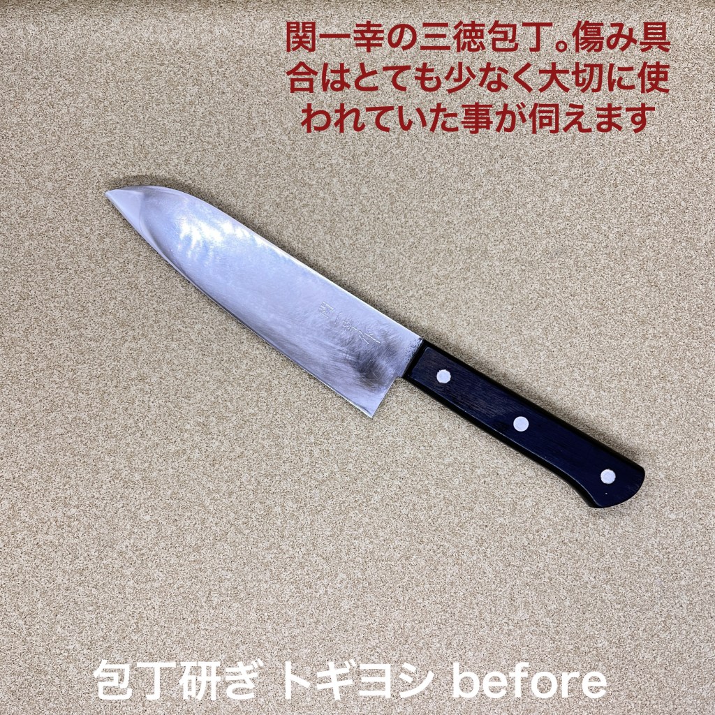 トギヨシの木元です。今日はこの一本を研ぎ上げました。関一幸こ三徳包丁。傷み具合とても少なく、研ぐのですか?と思うほど良い状態でした。刃先を光に当てると少し白い筋が見えまして、切れにくく感じられた事が分かりました。もちろん研ぎ上げた後は刃先に白い筋は見えなくなっています。トギヨシでは包丁研ぎの依頼お待ちしております。