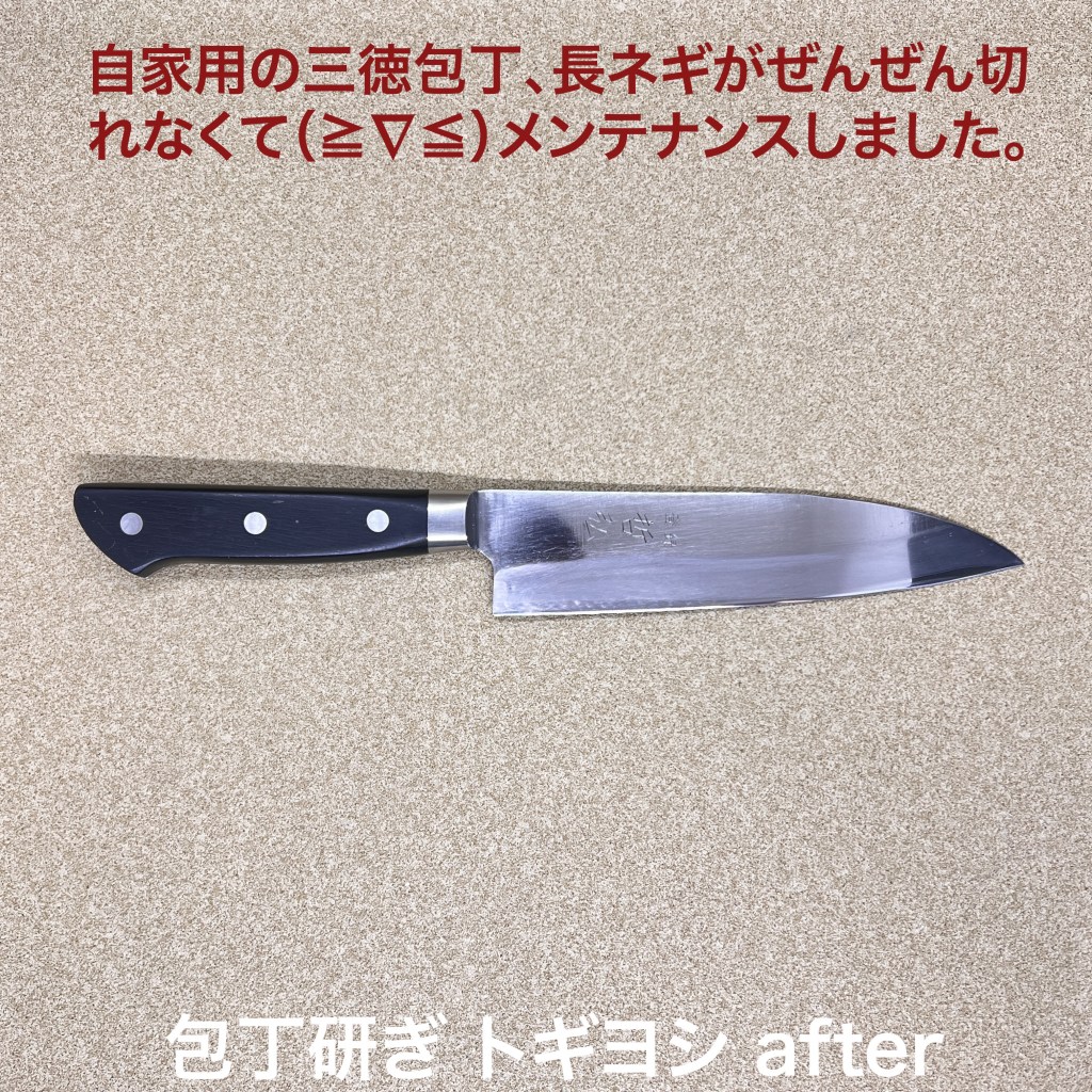 トギヨシの木元です。今日はこの1本を研ぎ上げました。自家用の哲弘三徳包丁。晩御飯に蕎麦を食べたのですが、長ネギがぜんぜん切れなくて、こりゃダメだという事で研ぎました。あと気合いを入れて表面をバフ仕上げしてピッカピカ!研ぎ師の家の包丁が切れなかったら本末転倒だね。トギヨシでは包丁研ぎの依頼お待ちしております。