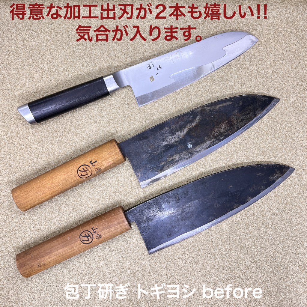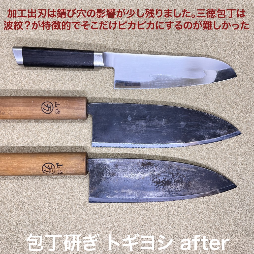 トギヨシの木元です。今日はこの3本を研ぎ上げました。得意な加工出刃が2本も!薄い作りで刃が反っているのため研ぐのが難しいです。一本は刃先に錆びがあり影響は残りました。関孫六の三徳包丁は波紋が特徴的な包丁。ただ機械加工で作られたモノだと思われ裏も表も同じ形。ご自身で研がれて傷が入ったのも直して欲しいとのこと。波紋の上側はサンドブラストで霞加工されていて手作業では復元不可能なため耐水ペーパーで霞風にしました。関孫六のラベルはプリントなので消えてしまいましたが。トギヨシでは包丁研ぎの依頼お待ちしております。