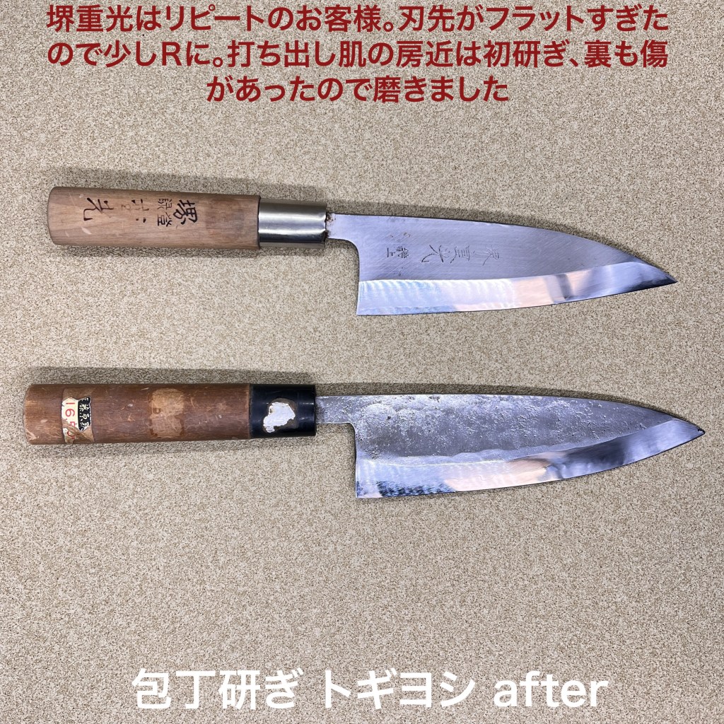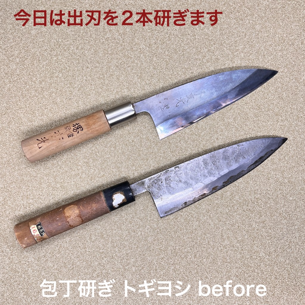 トギヨシの木元です。今日はこの2本を研ぎ上げました。堺重光の出刃包丁はリピートのお客様。いつもありがとうございます。錆びも無く大切に使われているのがわかります。今回もバッチリ仕上がりました。房近の出刃包丁は初研ぎ。小刃が少し幅広く、ご自身で研がれて刃先に集中してしまったのですね。裏もたくさん傷があり、かなり格闘された様子が見受けられました。刃先をしっかり出して、欠けを落として仕上げました。出刃包丁は磨き上げるのが楽しみなんです。トギヨシでは包丁研ぎの依頼お待ちしております。