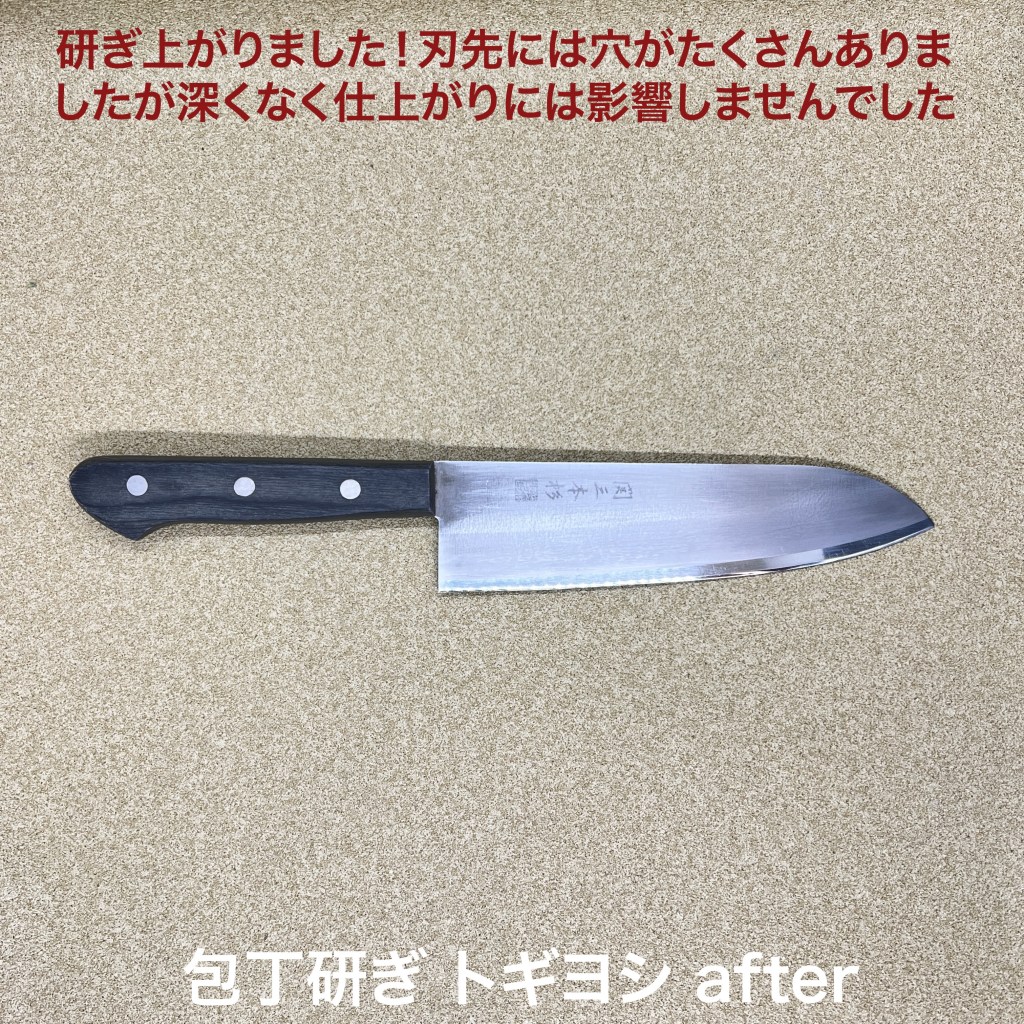 トギヨシの木元です。今日はこの1本を研ぎ上げました。関三本杉の三徳包丁。刃先はかなり傷んでおり、#120で落としたら錆び穴もありました。錆び穴が見えなくなるくらい落としています。材質は硬めかな?#220で切り刃を付けるのも少々時間がかかりました。多分最初に使う時、研ぐ前と差にビックリすると思います。😉どんな反応されるか楽しみだなあートギヨシでは包丁研ぎの依頼お待ちしております。