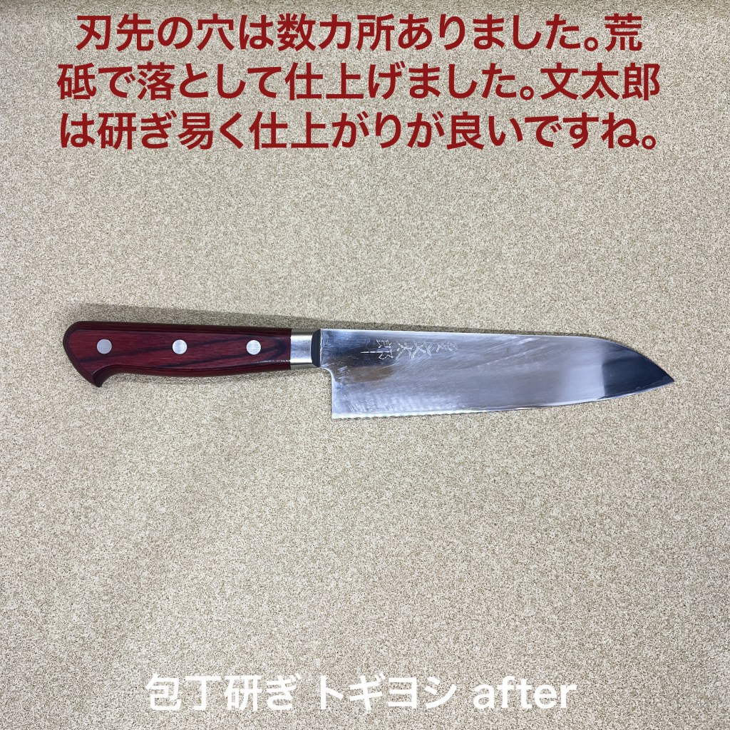 トギヨシの木元です。今日はこの1本を研ぎ上げました。リピートのお客様、いつもありがとうございます。前回研いだのは昨年11月、ちょっと早いかな?とおっしゃってましたが刃先には小さな穴が数カ所あり、結構傷んでいました。荒砥で刃先を落として刃を付け直しました。文太郎は研ぎ易く、かといって柔らか過ぎず、仕上げもスパッと決まりした。トギヨシでは包丁研ぎの依頼お待ちしております。