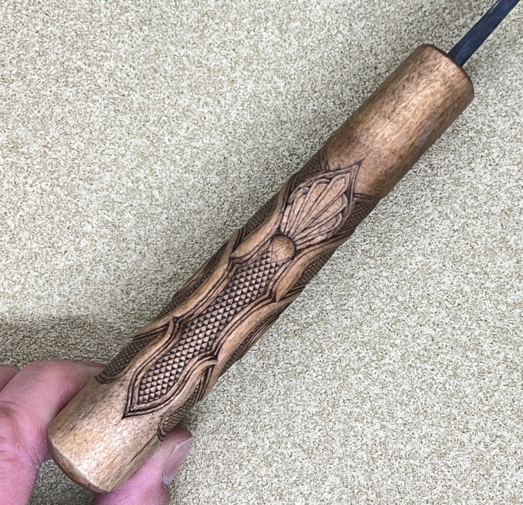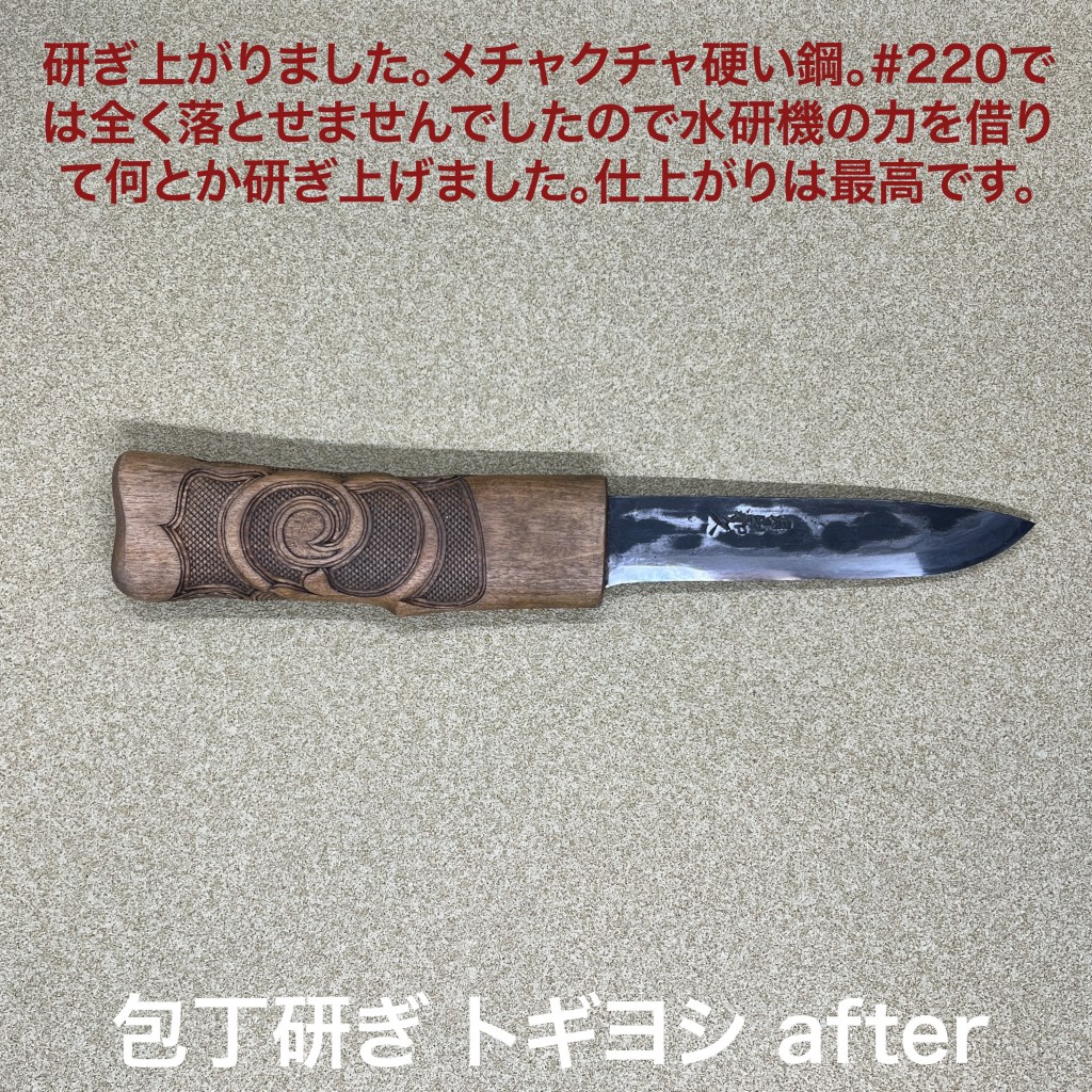 トギヨシの木元です。今日はこの1本を研ぎ上げました。シカ猟師さんのマキリ。ご自身で研がれていましたがあともう少しというレベルの仕上がりでした。小刃が急角度なので樹木や草など切るには良いのですが獲ったシカを解体するには切れ味が足らず持ち込まれました。研ぎ始めたら兎にも角にも材質が硬いことに焦り、明日納品なのでこのペースでは徹夜になりそうでしたので水研機の力を借りて刃を整えてから手研ぎで仕上げました。仕上がった切れ味は最高!この厚みのある刃でこんなに軽く切れるのか?というレベル。驚きです。あと柄の彫り物もなんと素晴らしいことか、このナイフを持つことに幸せを感じました。トギヨシでは包丁研ぎの依頼お待ちしております。