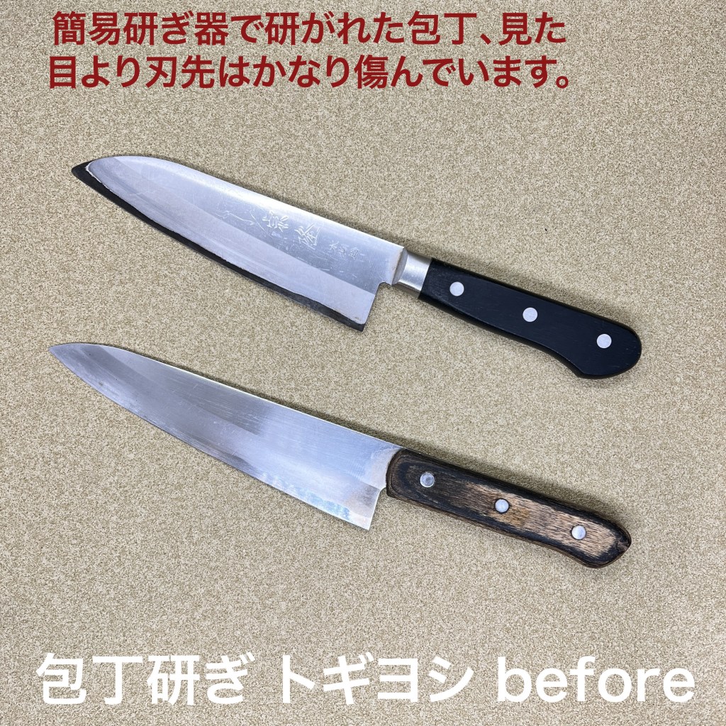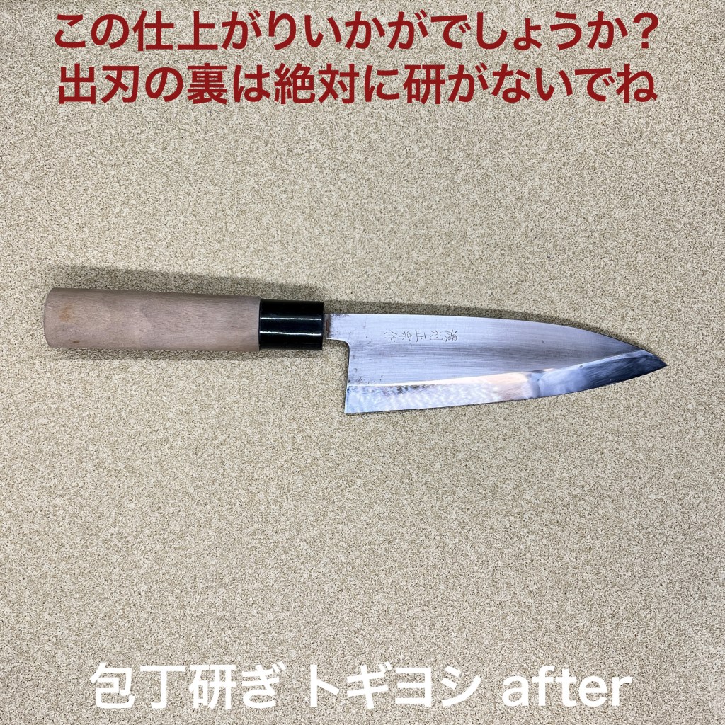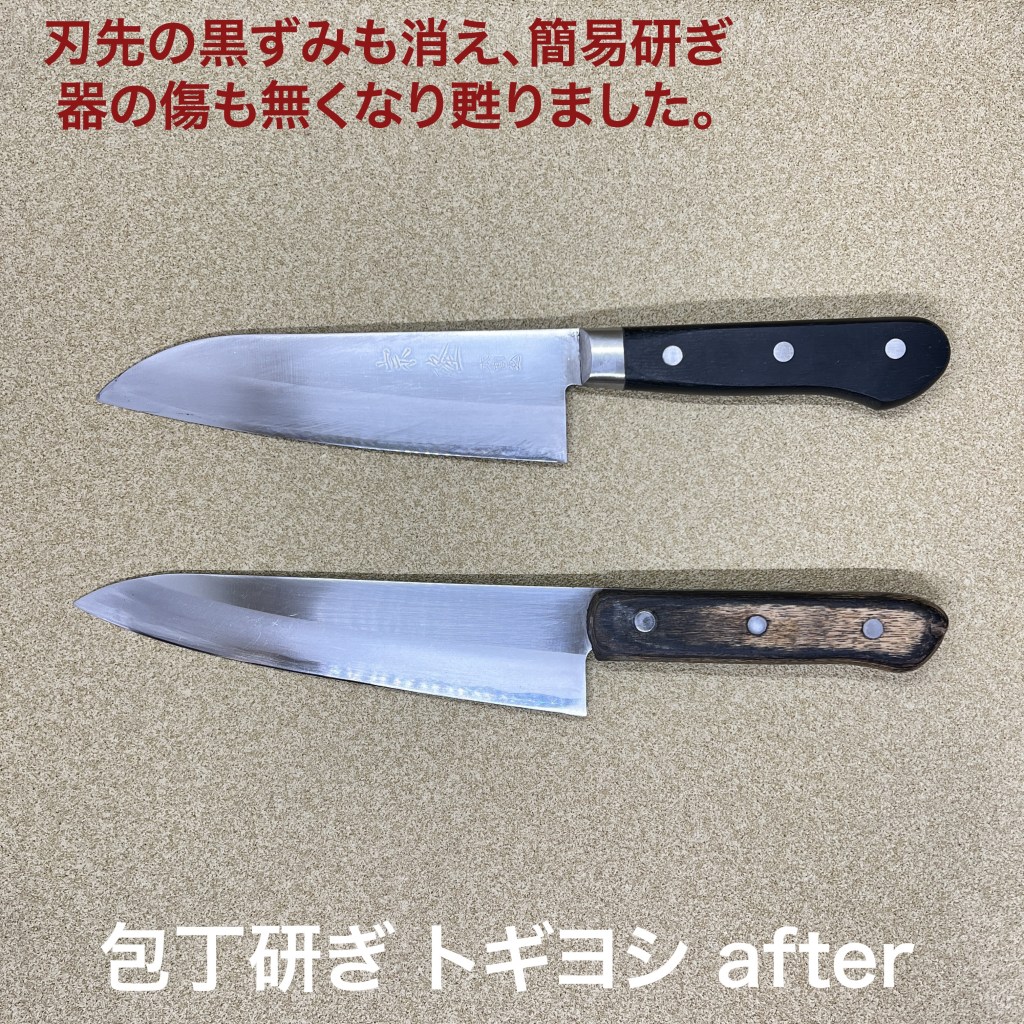 トギヨシの木元です。今日はこの3本を研ぎ上げました。濃州正宗の薄出刃はご自身で格闘の末切れ味が上がらなかったので持ち込まれました。前に砥石を購入いただいたお客様。出刃を#1000だけで仕上げるのは私でも無理です(≧∀≦)一旦荒砥で切り刃を全部落としてそこから仕上げました。結構な作業量になります。宗隆の三徳包丁は京都修学旅行土産の定番。裏にはお名前とありがとうと刻印されています。これは一生離せない大切な包丁です。簡易研ぎ器で研いでも全然切れなくてとのこと。はい簡易研ぎ器を使うと一瞬切れますがあっという間に切れなくなります。もう一本の牛刀も刃先に細かい亀裂というか簡易研ぎ器の傷がたくさんあり仕上げるのに苦労しました。トギヨシでは包丁研ぎの依頼お待ちしております。