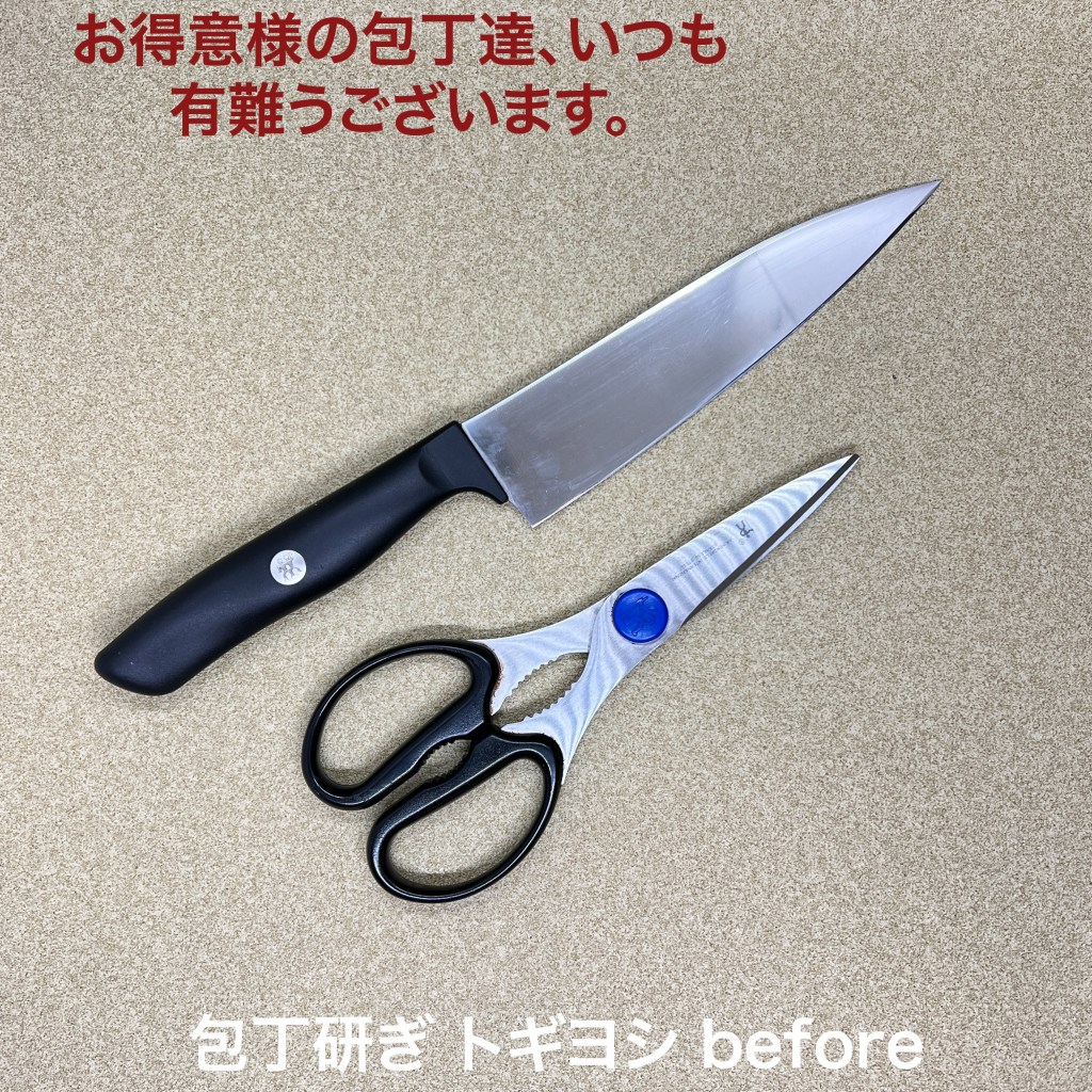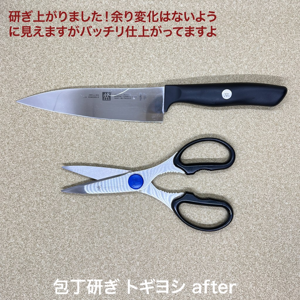 トギヨシの木元です。今日はこの2本を研ぎ上げました。ヘンケルスのシェフナイフとキッチンハサミ。お得意様の包丁。いつもありがとうございます。シェフナイフは先端が尖っているので好みが分かれるところ。前回研いでから順当な摩耗具合。傷みを落として順調に仕上がりました。ハサミはギザ刃のタイプ。この状態で研ぎ上げることは出来ないので、ギザは無くなることは了承済みです。気持ちギザ感を残したいので220番だけで仕上げています。試し切りしてみましたが布も逃げずバッチリでした。トギヨシでは包丁研ぎの依頼お待ちしております。