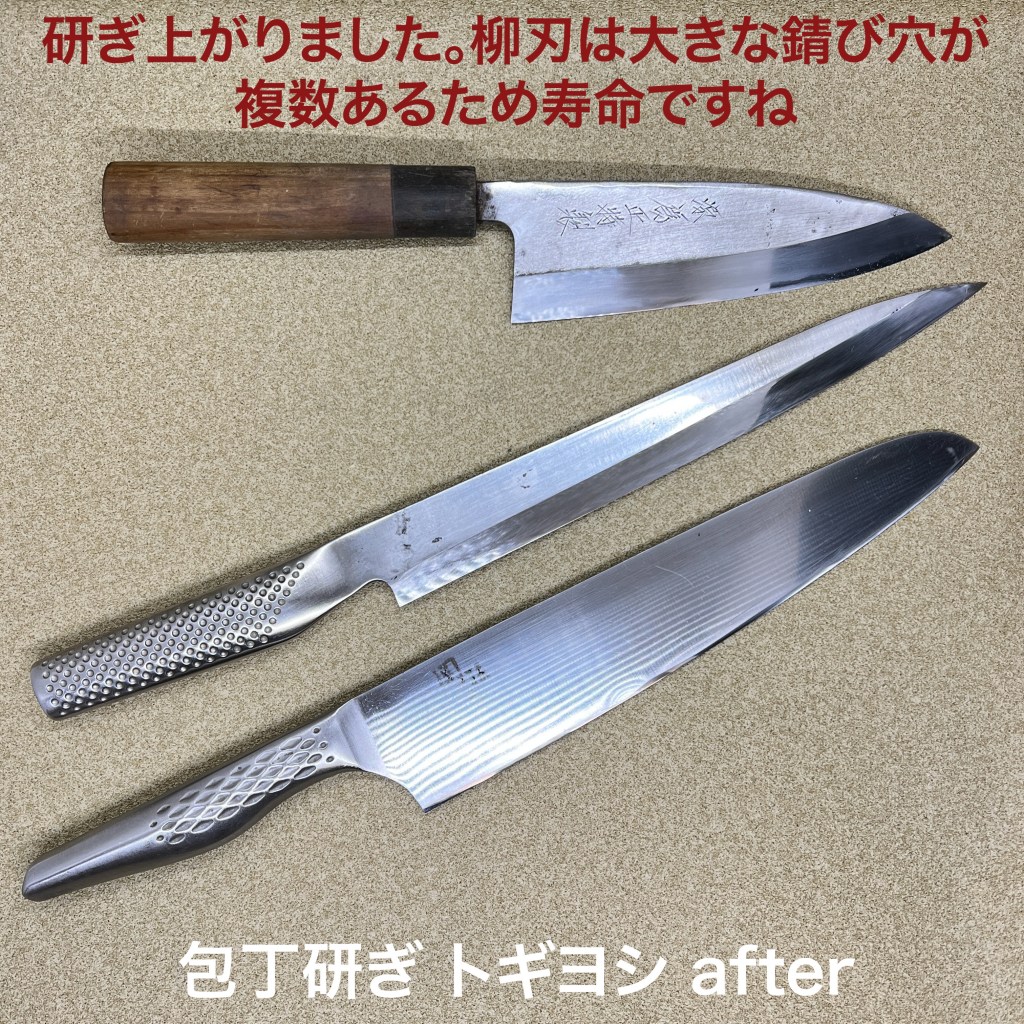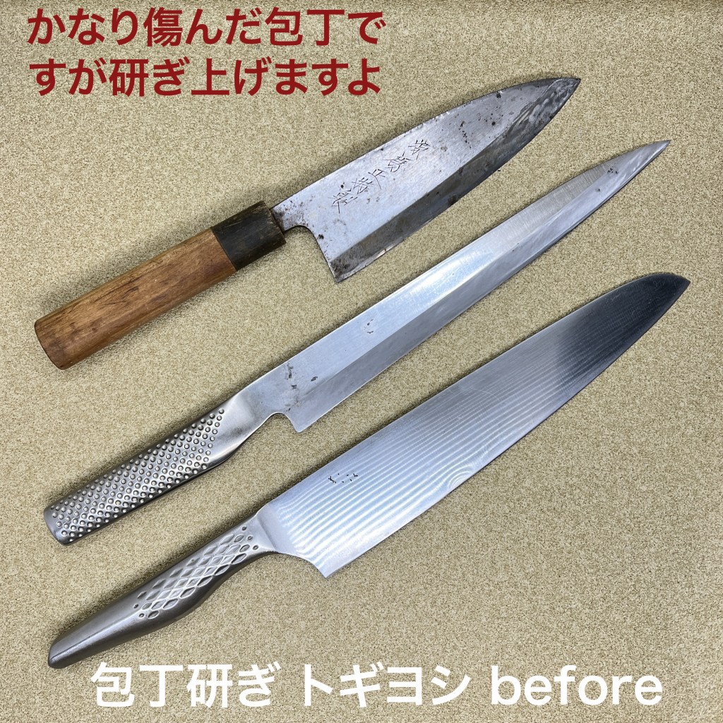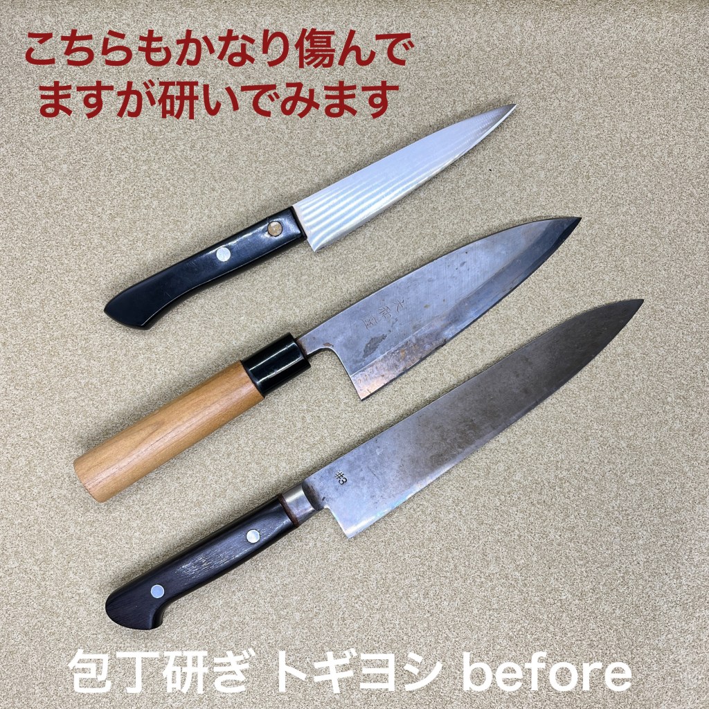 トギヨシの木元です。今日はこの6本の強者達を研ぎ上げました。大きな包丁はKAIの匠創シェフズナイフ初めて見る形です。刃先の手前三分の一位に10ミリ位の凹みがあり仕上げに悪影響するかと思いましたが無事仕上がりました。匠創の柳刃は錆びが深く進行していて、幸い刃先には影響はありませんでしたが力を入れたり落としたら割れる可能性がり寿命と判断します。出刃は背がボコボコ、ディスクグラインダで削って綺麗にしています刃先は先端に少々錆びがありましたが問題ありませんでした。木屋の牛刀は柄が錆びで膨らむほど永く使われています。刃は錆びもなく問題ないので研ぎ上げがり、出刃は刃先を少し落として切刃をいちから作り直して研ぎ上げました。ペティは柔らかめの材質なので仕上げに手こずりました。トギヨシでは包丁研ぎの依頼お待ちしております。