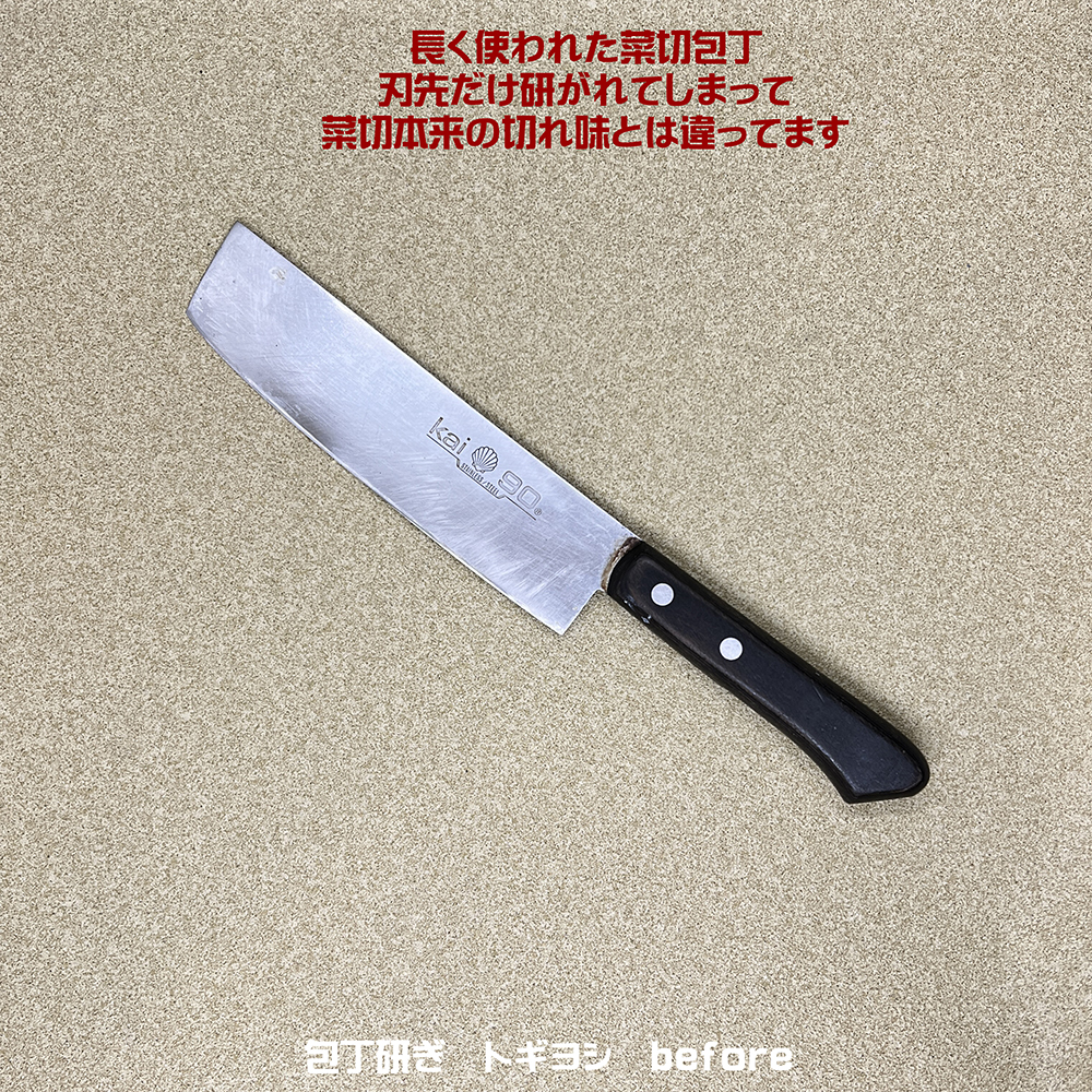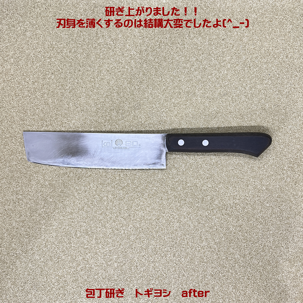 トギヨシの木元です。今日はこの1本を研ぎ上げました。長く使われた菜切包丁。菜切包丁は薄い刃が特徴の包丁。刃先だけ研がれてしまい少し厚くなっていたので刃身を落としながら仕上げました。トギヨシでは包丁研ぎの依頼お待ちしております。