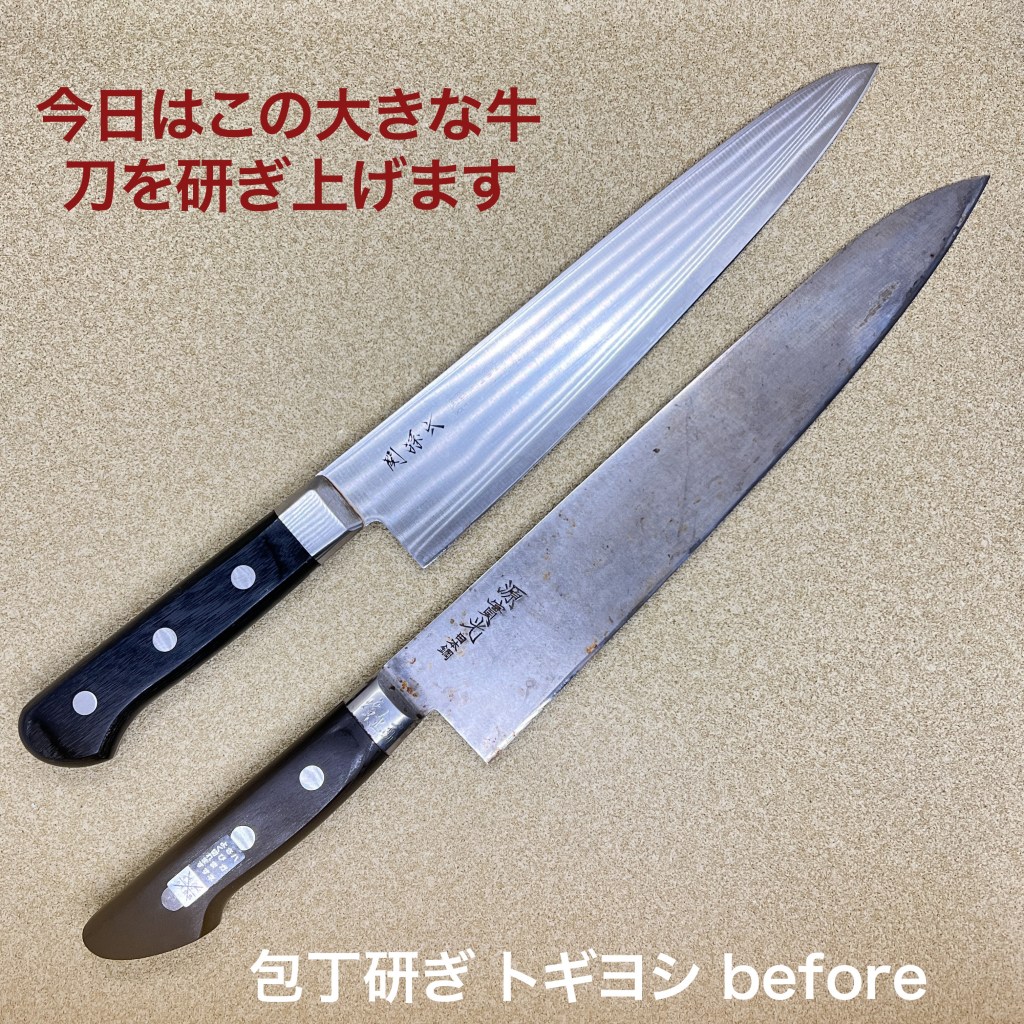 トギヨシの木元です。今日はこの2本を研ぎ上げました。関孫六の大きな牛刀と源濱光の鋼の牛刀270ミリ。どちらもご近所で研いでくれる方がいたそうですが今回はトギヨシにご依頼いただきました。どちらも片刃で研がれていましたが本来の形に戻すことになりました。と言っても表8割、裏2割の割合で研ぐようにしていますので近いと言えば近いですが。今回から2年近く使った仕上げ砥石キングG1を使い切ってしまったので刃の黒幕#8000をデビューさせましたところ仕上がりはG1以上でした😉トギヨシでは包丁研ぎの依頼お待ちしております。
