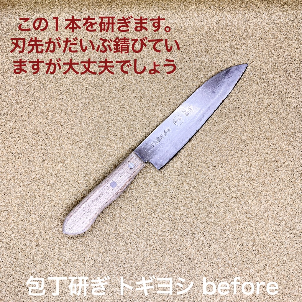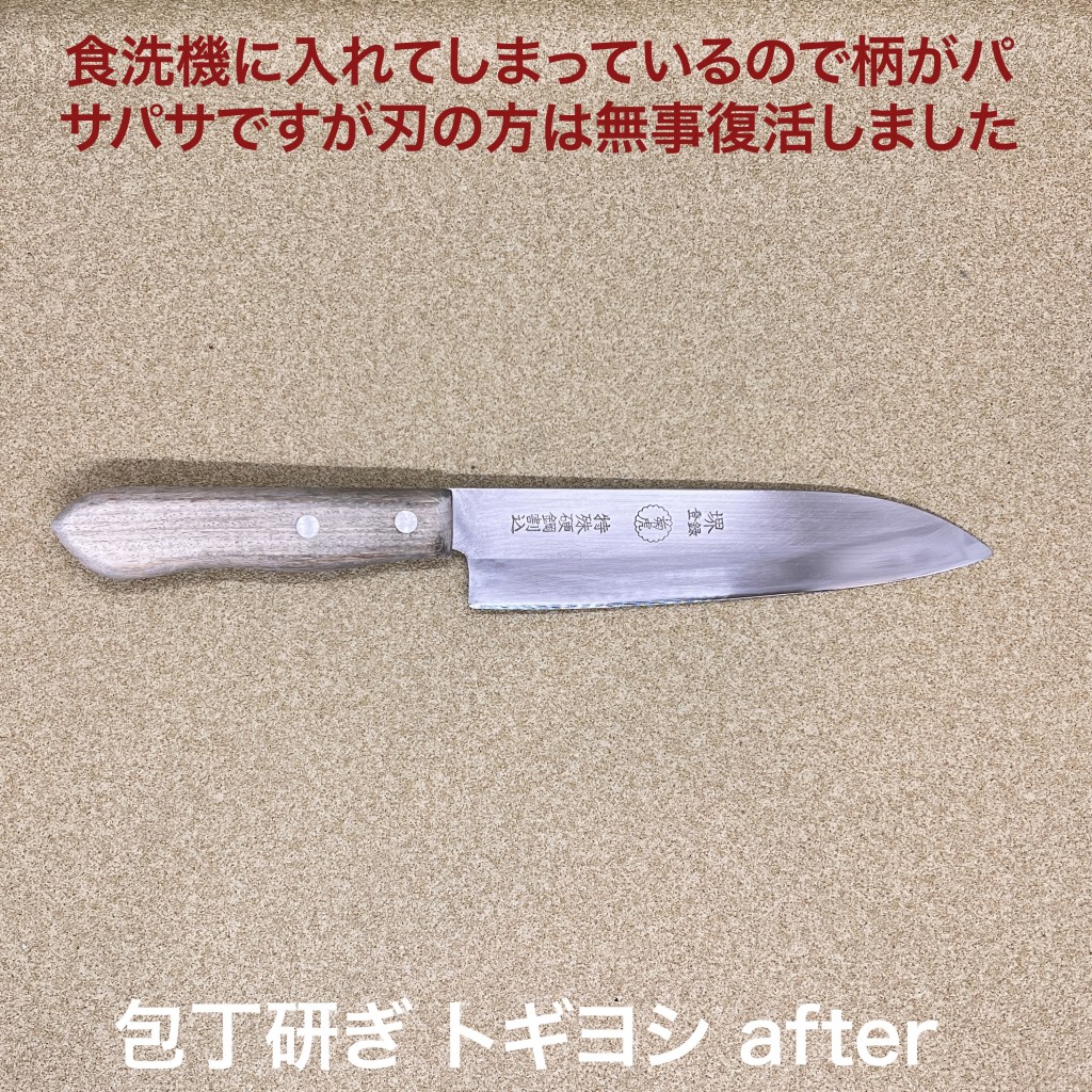 トギヨシの木元です。今日はこの1本を研ぎ上げました。菊虎の三徳包丁。見てすぐ思ったのは、食洗機に入れているのではと。木柄の油分がすっかり抜けていて柄がパサパサになっていました。受付時に確認したら、食洗機に入れてましたと。柄もそうですが刃も柔らかくなって包丁がダメになりますとお伝えしました。研ぎの方は手元が深く研ぎ過ぎていてそこを基準にすると刃幅か狭くなるのでそのままにして、刃全体の4/5を整えて研ぎました。もちろん1/5も研いでいますよ。あと傷も消して良い感じに仕上がりました。