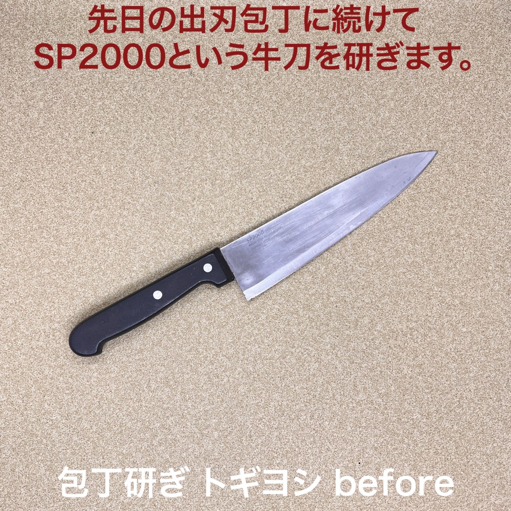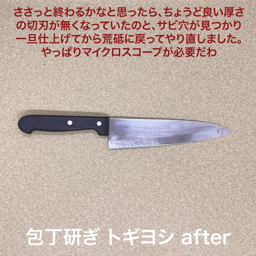 トギヨシの木元です。今日はこの1本を研ぎ上げました。先日の出刃に引き続き牛刀も出してくださいました。一見したところさほど傷みは無いように思ったのですが、刃身が思った以上に厚くて良い切れ味になら無さそうでしたので荒砥に戻って刃身を落としました。その後一回仕上げた後サビ穴が出てきて、中砥に戻って仕上げ直しました。刃先を見るのにマイクロスコープは必需品ですね。前のは壊れてしまいました。今月も後10日、絶賛包丁研ぎのご依頼受付中!