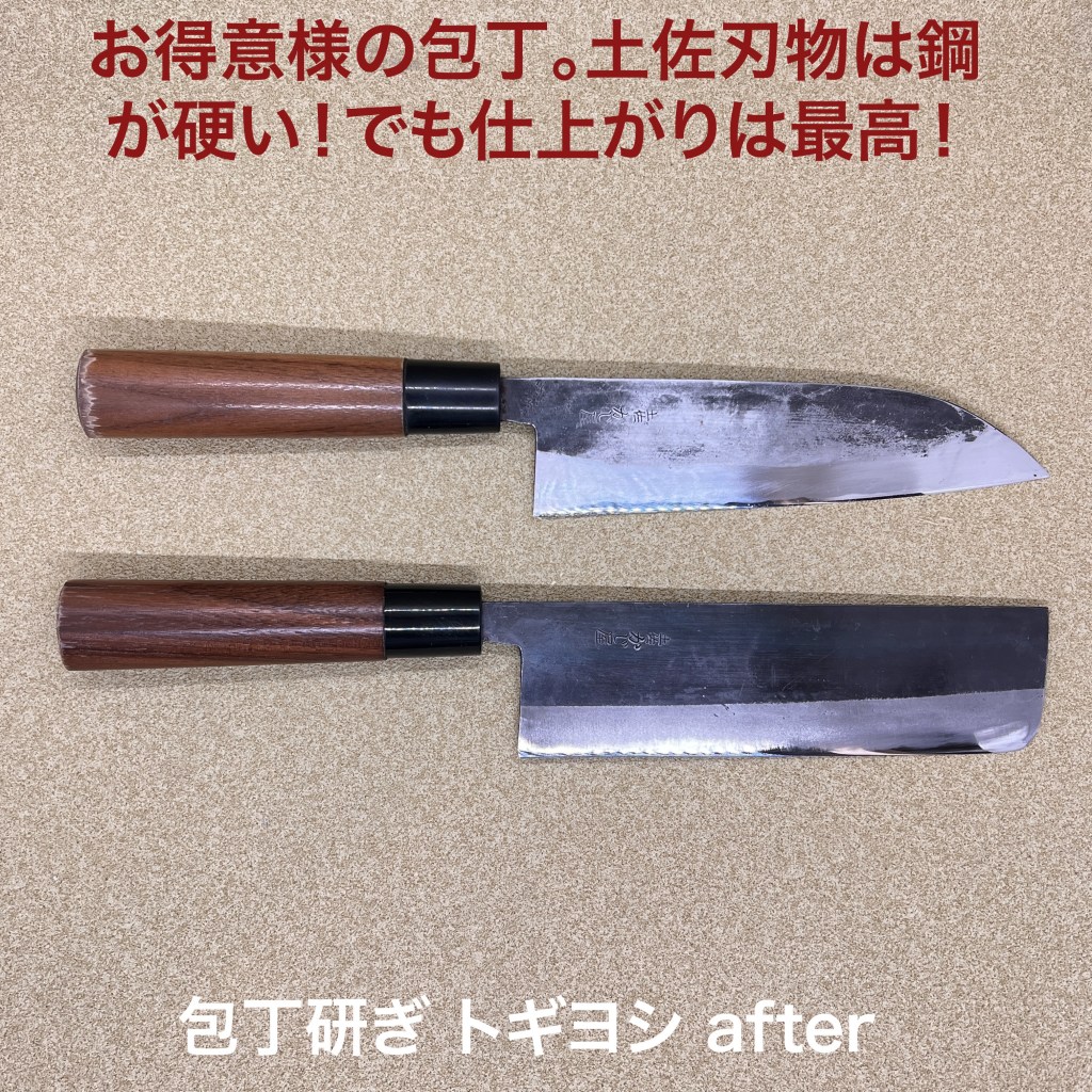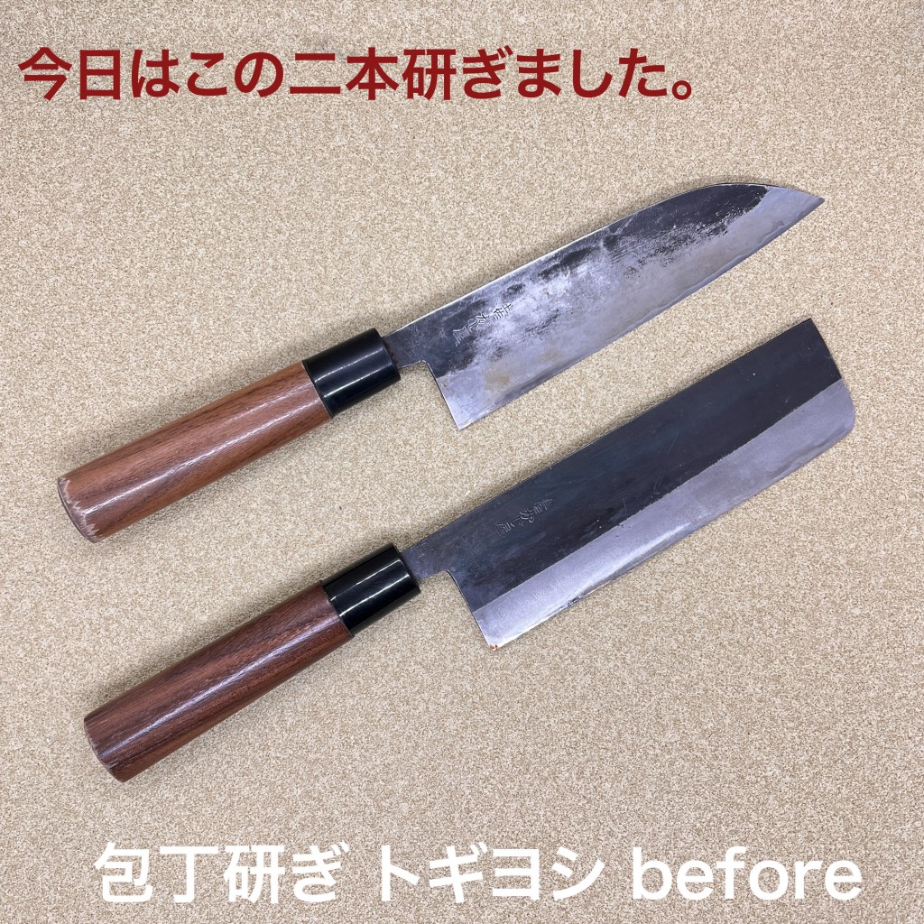 トギヨシの木元です。今日はこの2本を研ぎ上げました。お得意様の包丁。いつもありがとうございます。土佐包丁の鋼は硬い!砥石の上をスルスル滑ります。それでも何度か研いで形は出来ているので刃先に集中して研ぎ上げました。包丁研ぎのご依頼をお待ちしています。